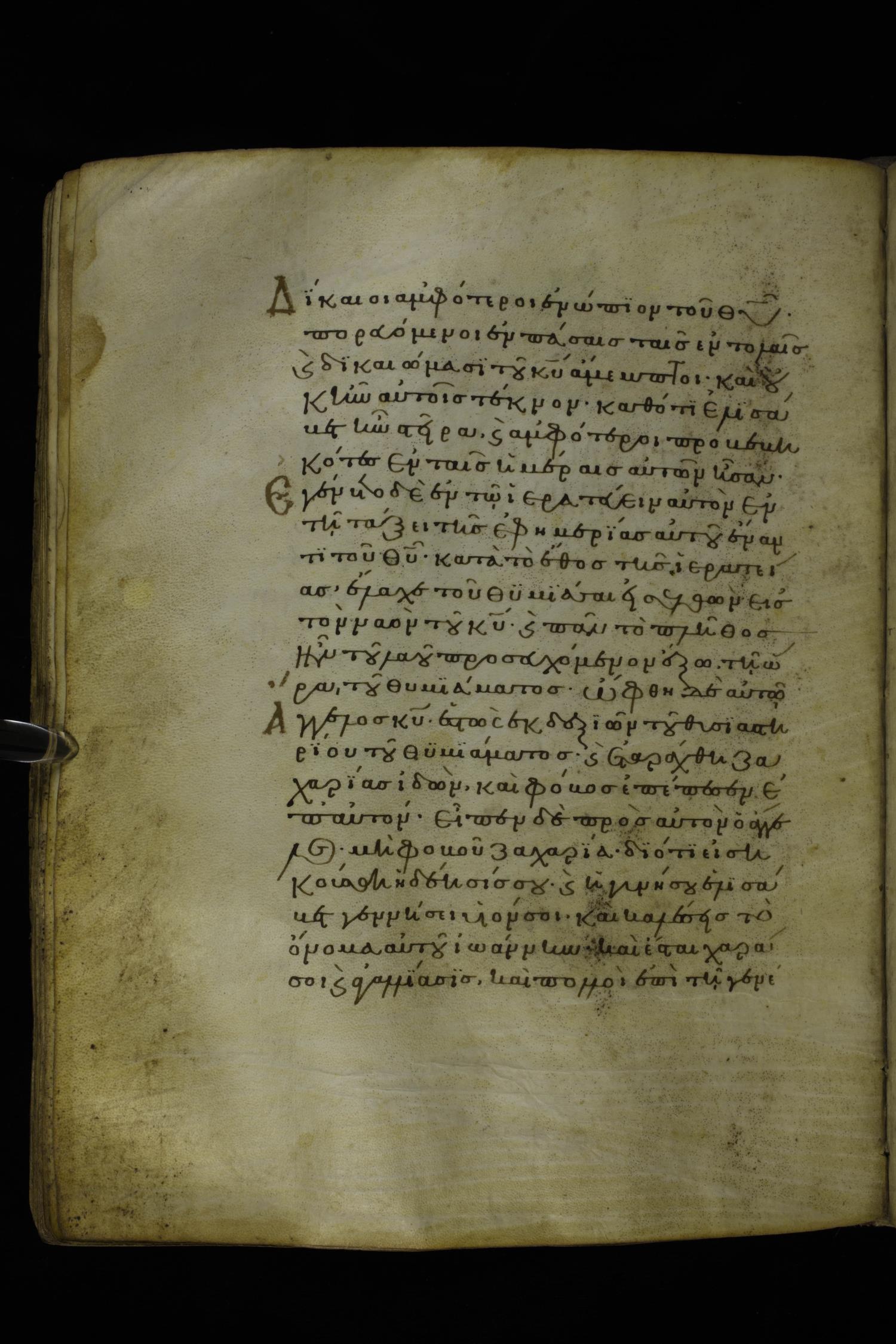 Twelfth century minuscule of the Gospels on parchment; 277 leaves, 1 column, 22 lines per column. Images were taken at the National Library of Greece in Athens.