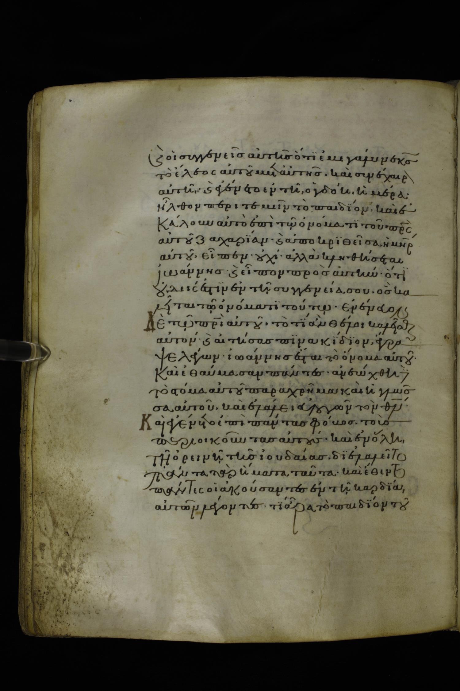 Twelfth century minuscule of the Gospels on parchment; 277 leaves, 1 column, 22 lines per column. Images were taken at the National Library of Greece in Athens.
