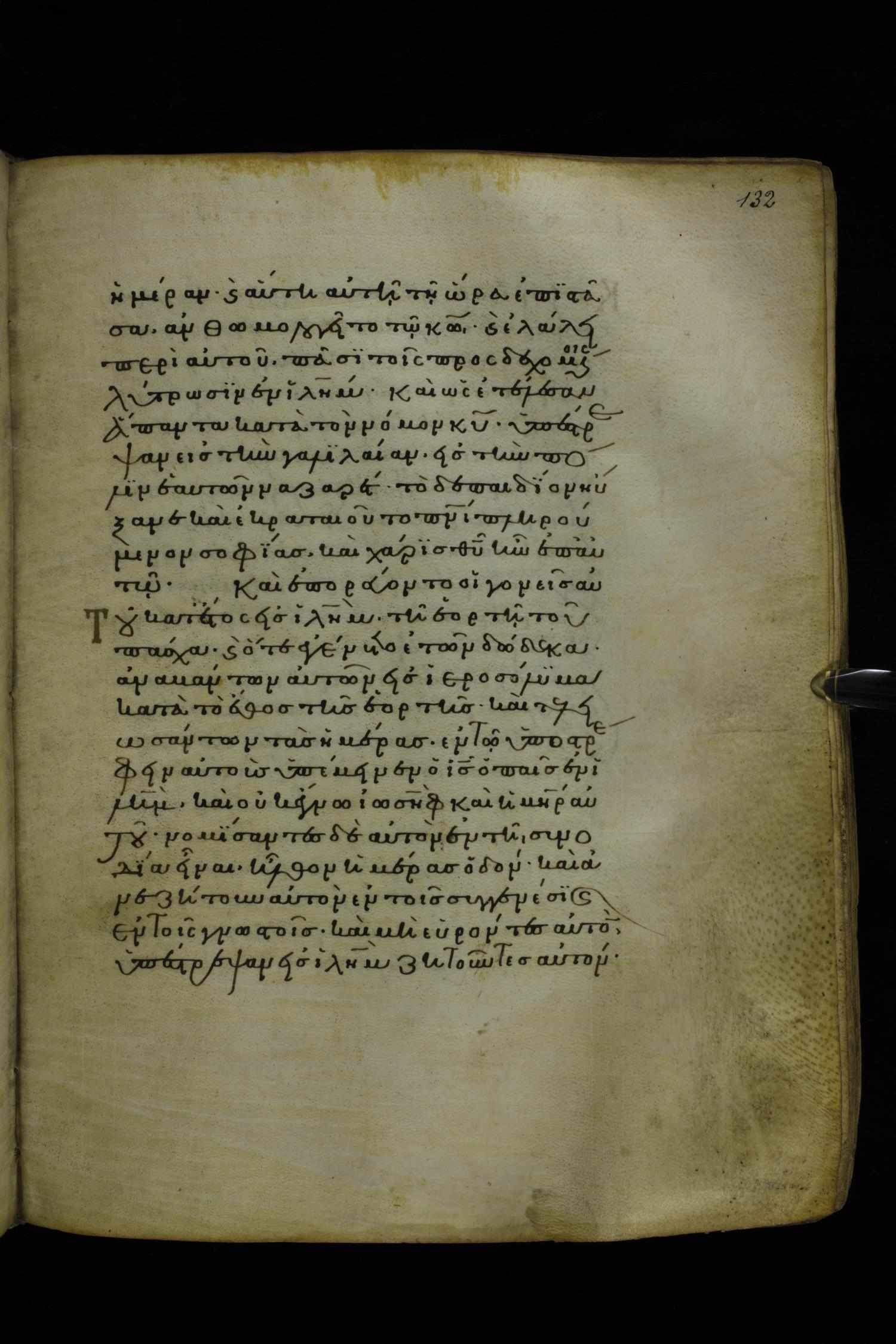 Twelfth century minuscule of the Gospels on parchment; 277 leaves, 1 column, 22 lines per column. Images were taken at the National Library of Greece in Athens.
