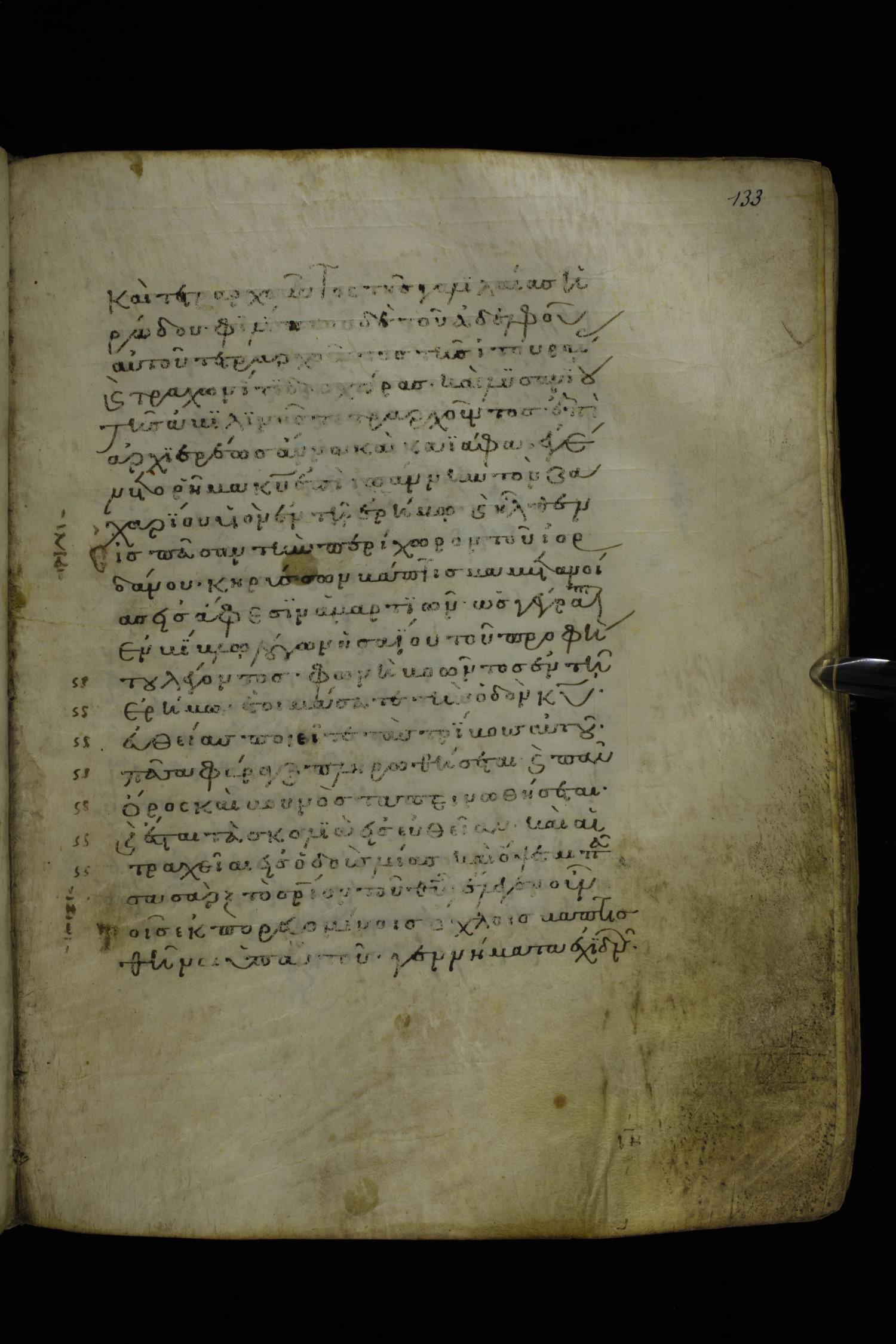 Twelfth century minuscule of the Gospels on parchment; 277 leaves, 1 column, 22 lines per column. Images were taken at the National Library of Greece in Athens.