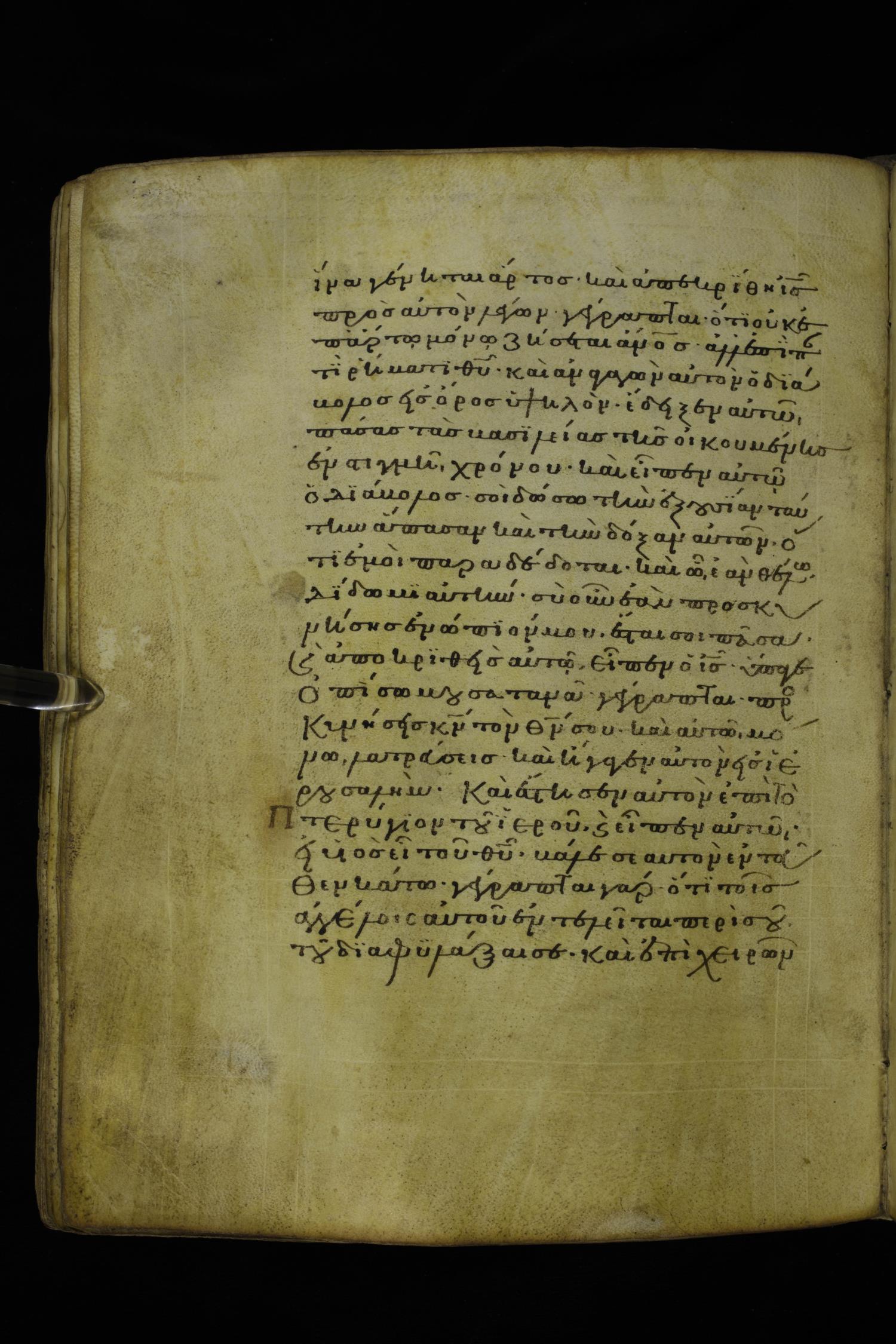 Twelfth century minuscule of the Gospels on parchment; 277 leaves, 1 column, 22 lines per column. Images were taken at the National Library of Greece in Athens.