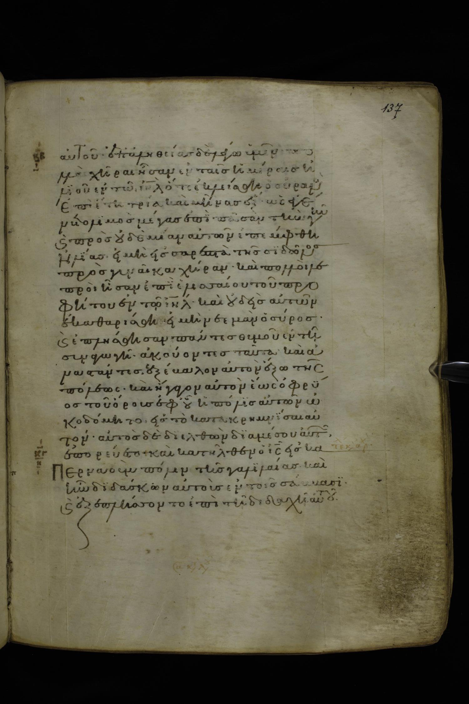 Twelfth century minuscule of the Gospels on parchment; 277 leaves, 1 column, 22 lines per column. Images were taken at the National Library of Greece in Athens.