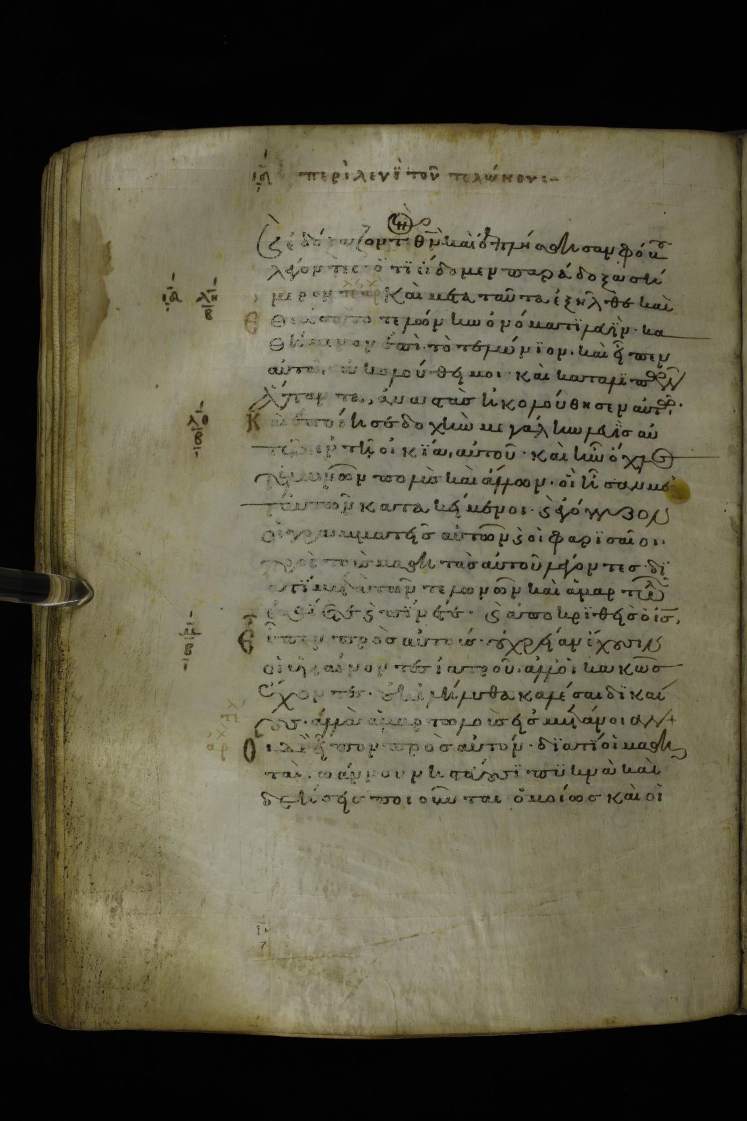 Twelfth century minuscule of the Gospels on parchment; 277 leaves, 1 column, 22 lines per column. Images were taken at the National Library of Greece in Athens.