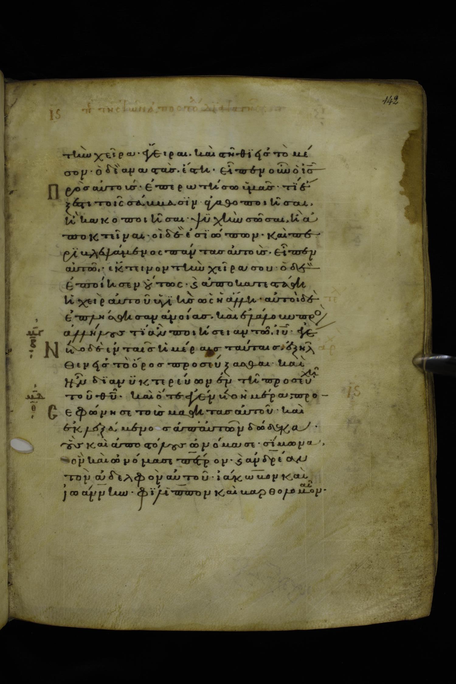 Twelfth century minuscule of the Gospels on parchment; 277 leaves, 1 column, 22 lines per column. Images were taken at the National Library of Greece in Athens.