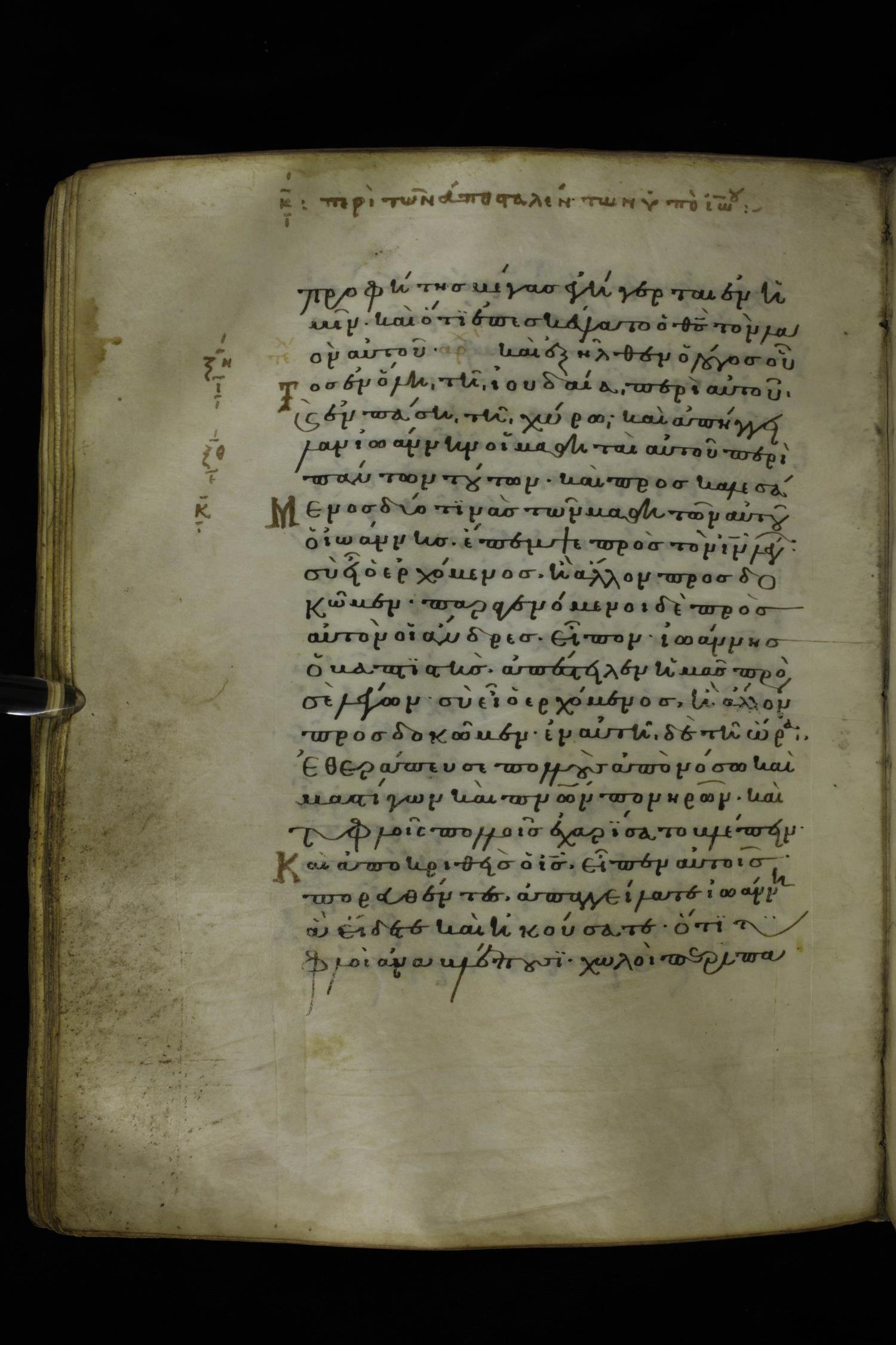Twelfth century minuscule of the Gospels on parchment; 277 leaves, 1 column, 22 lines per column. Images were taken at the National Library of Greece in Athens.