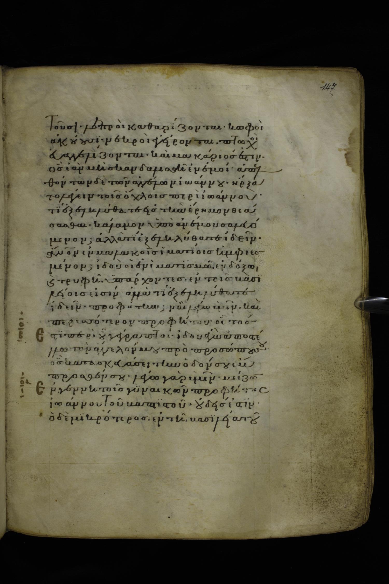Twelfth century minuscule of the Gospels on parchment; 277 leaves, 1 column, 22 lines per column. Images were taken at the National Library of Greece in Athens.