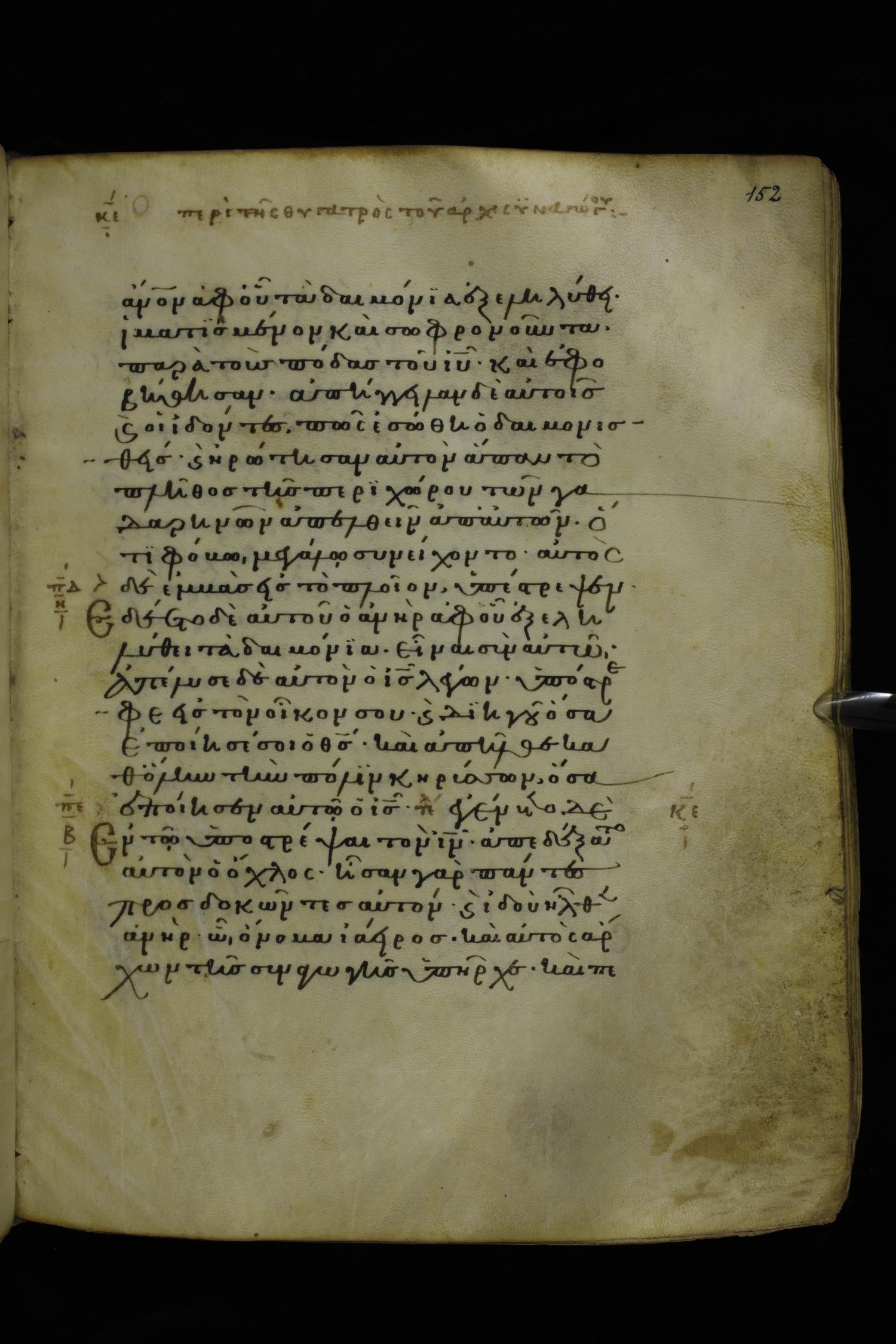 Twelfth century minuscule of the Gospels on parchment; 277 leaves, 1 column, 22 lines per column. Images were taken at the National Library of Greece in Athens.