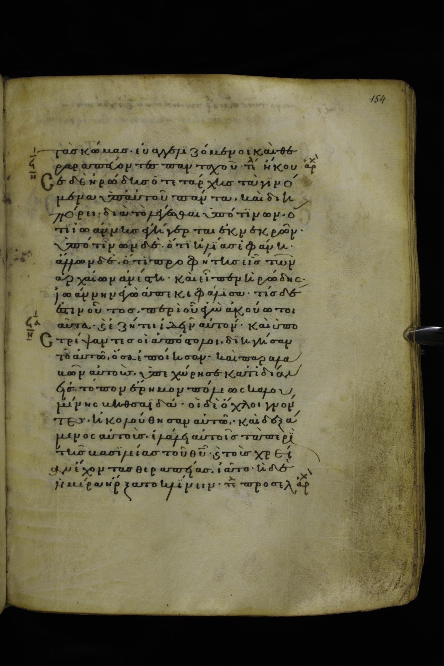 Twelfth century minuscule of the Gospels on parchment; 277 leaves, 1 column, 22 lines per column. Images were taken at the National Library of Greece in Athens.