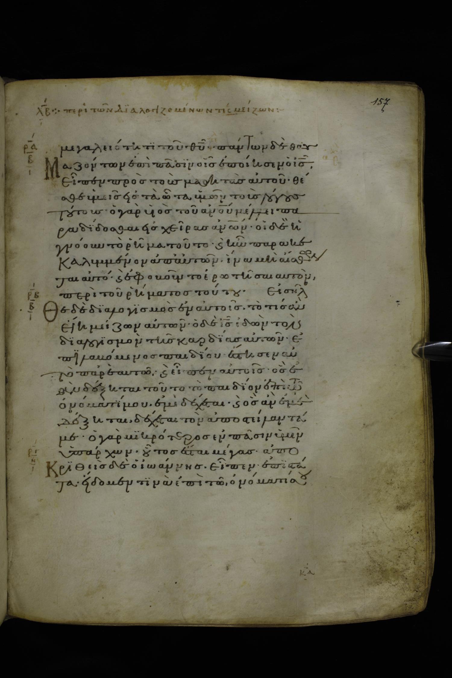 Twelfth century minuscule of the Gospels on parchment; 277 leaves, 1 column, 22 lines per column. Images were taken at the National Library of Greece in Athens.