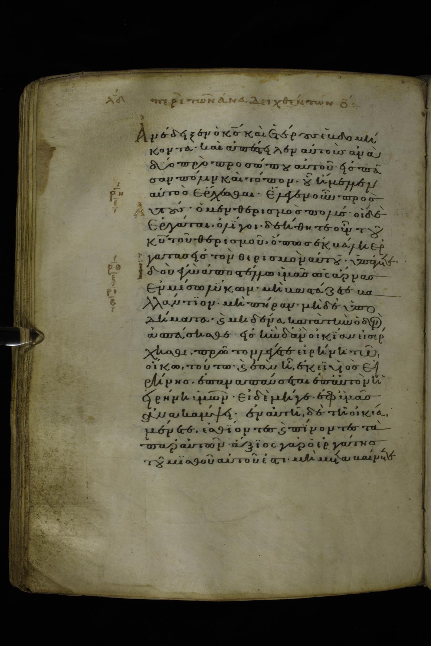 Twelfth century minuscule of the Gospels on parchment; 277 leaves, 1 column, 22 lines per column. Images were taken at the National Library of Greece in Athens.