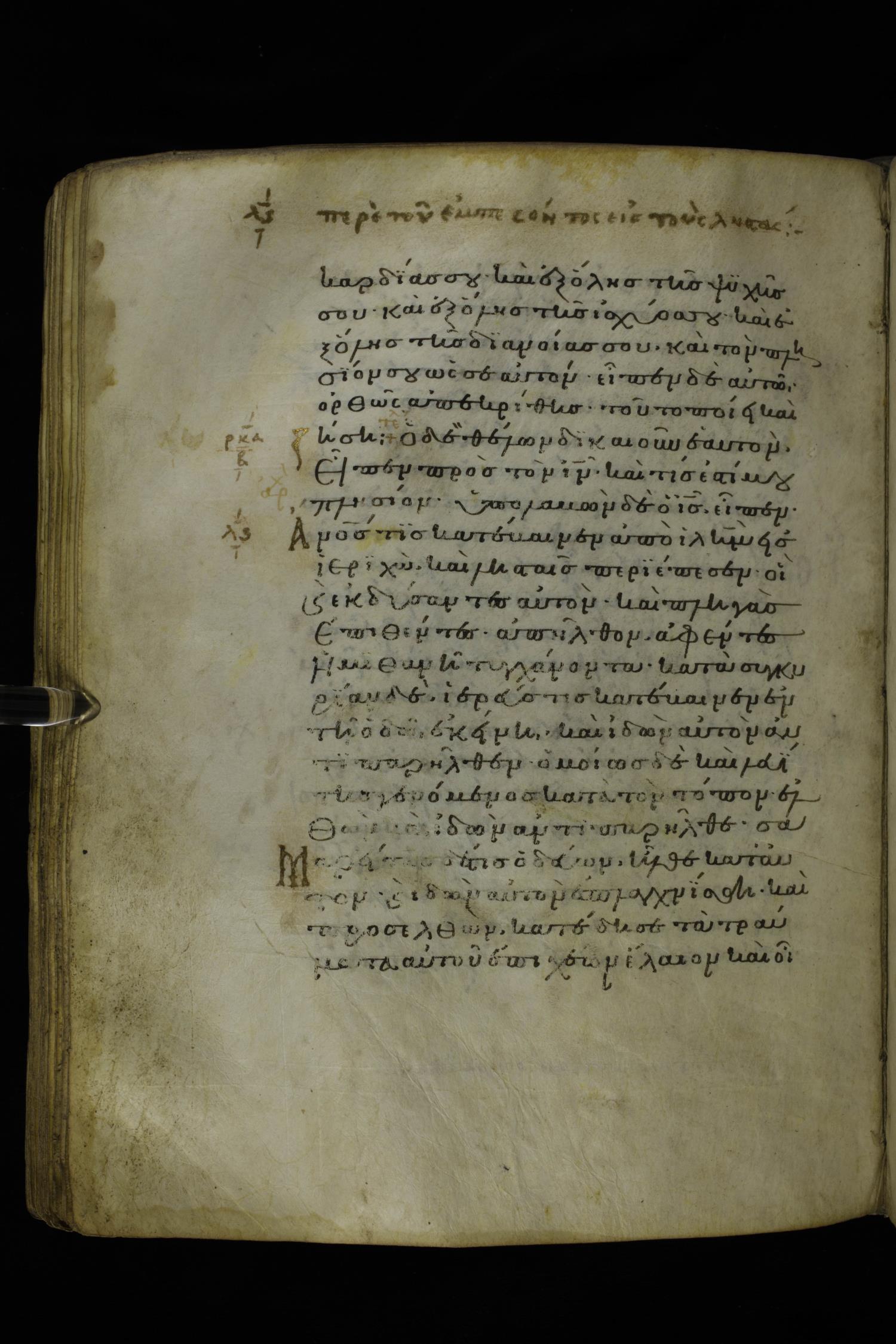 Twelfth century minuscule of the Gospels on parchment; 277 leaves, 1 column, 22 lines per column. Images were taken at the National Library of Greece in Athens.