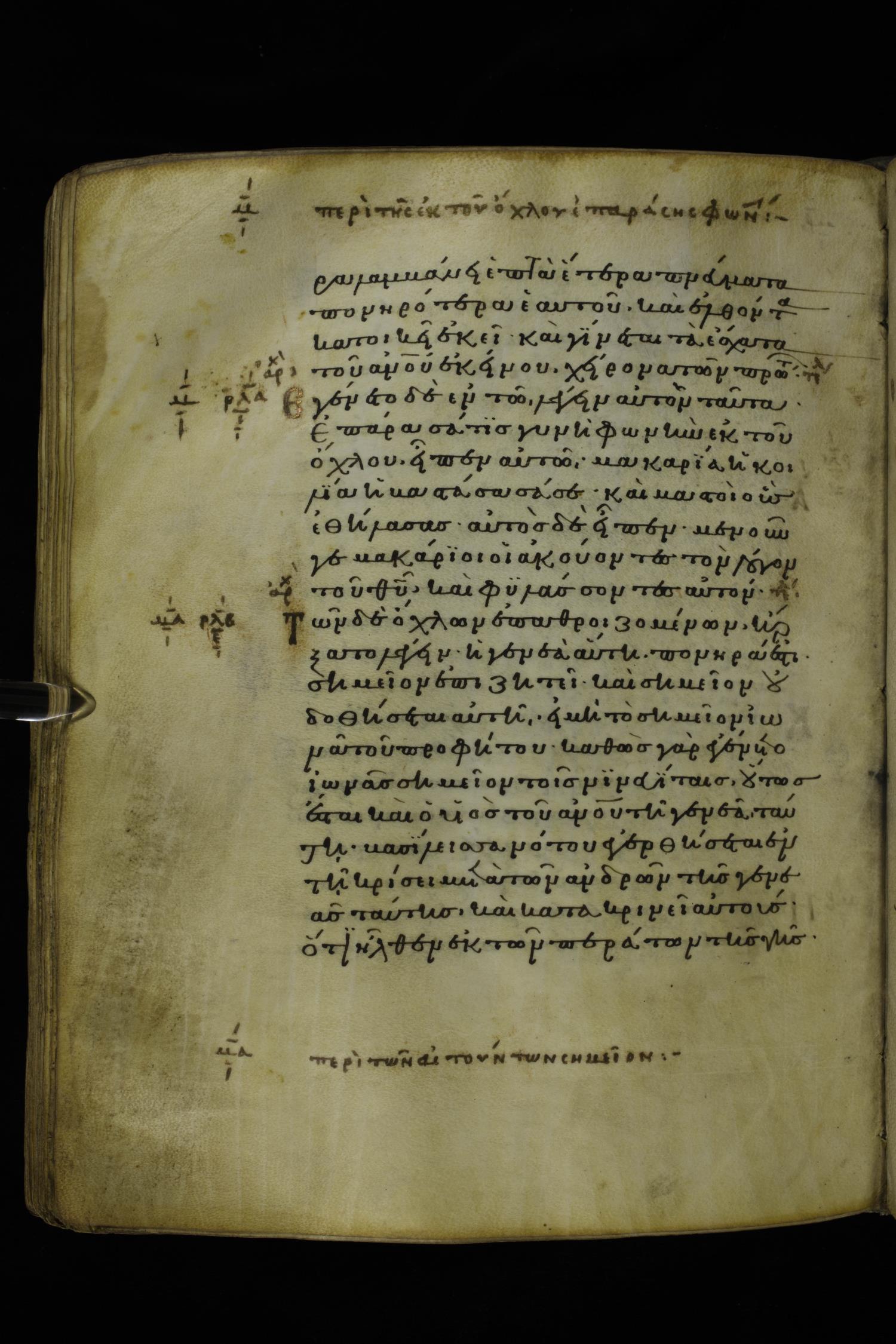 Twelfth century minuscule of the Gospels on parchment; 277 leaves, 1 column, 22 lines per column. Images were taken at the National Library of Greece in Athens.