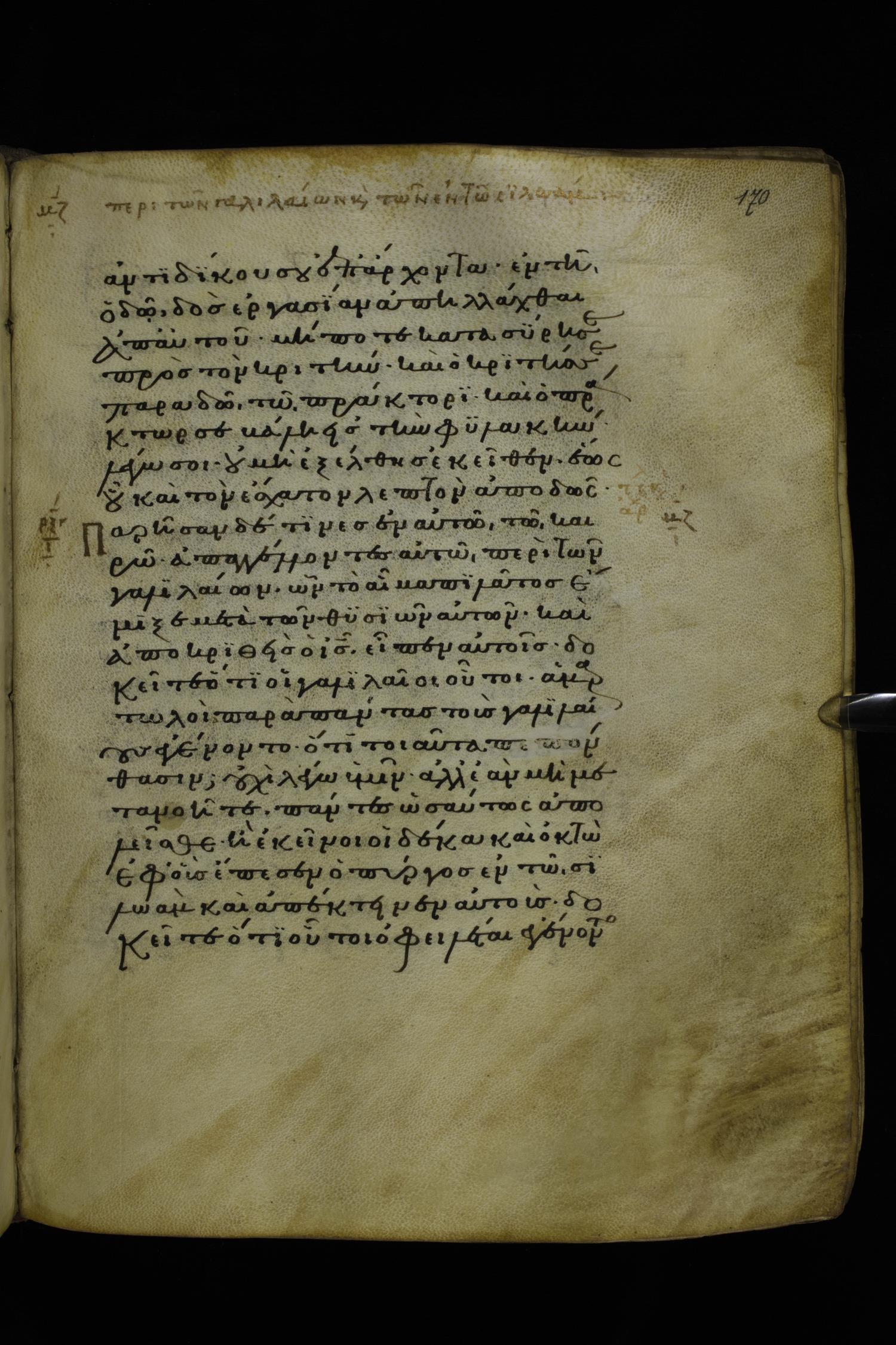 Twelfth century minuscule of the Gospels on parchment; 277 leaves, 1 column, 22 lines per column. Images were taken at the National Library of Greece in Athens.