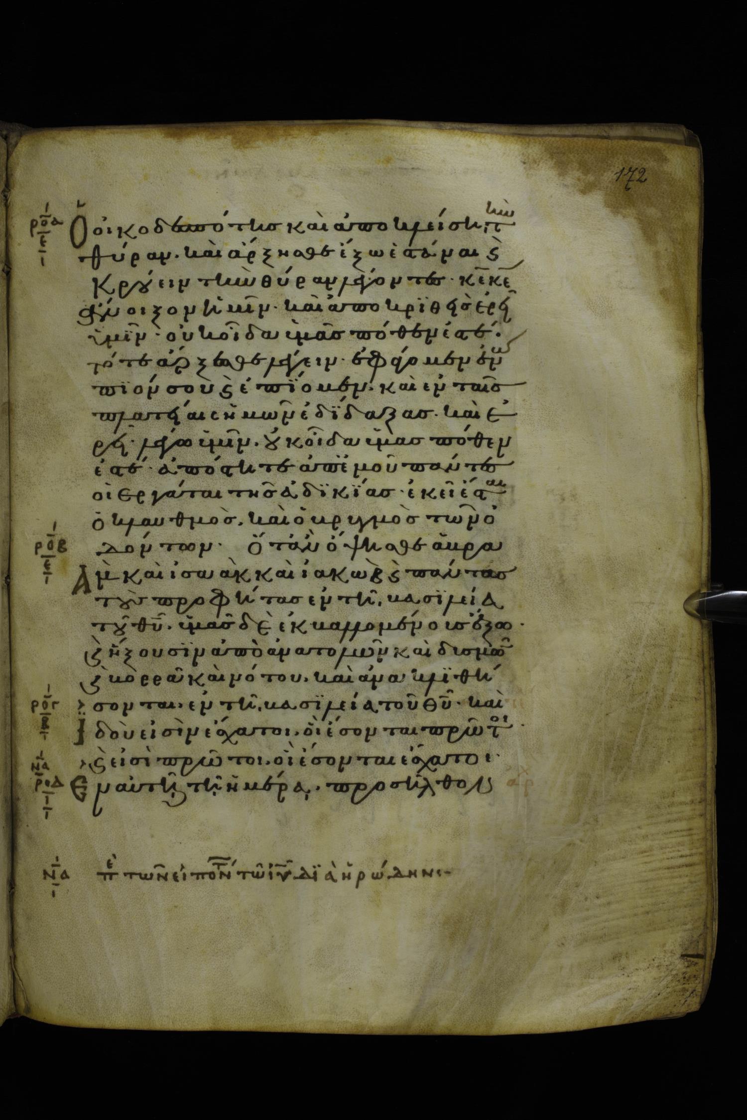 Twelfth century minuscule of the Gospels on parchment; 277 leaves, 1 column, 22 lines per column. Images were taken at the National Library of Greece in Athens.