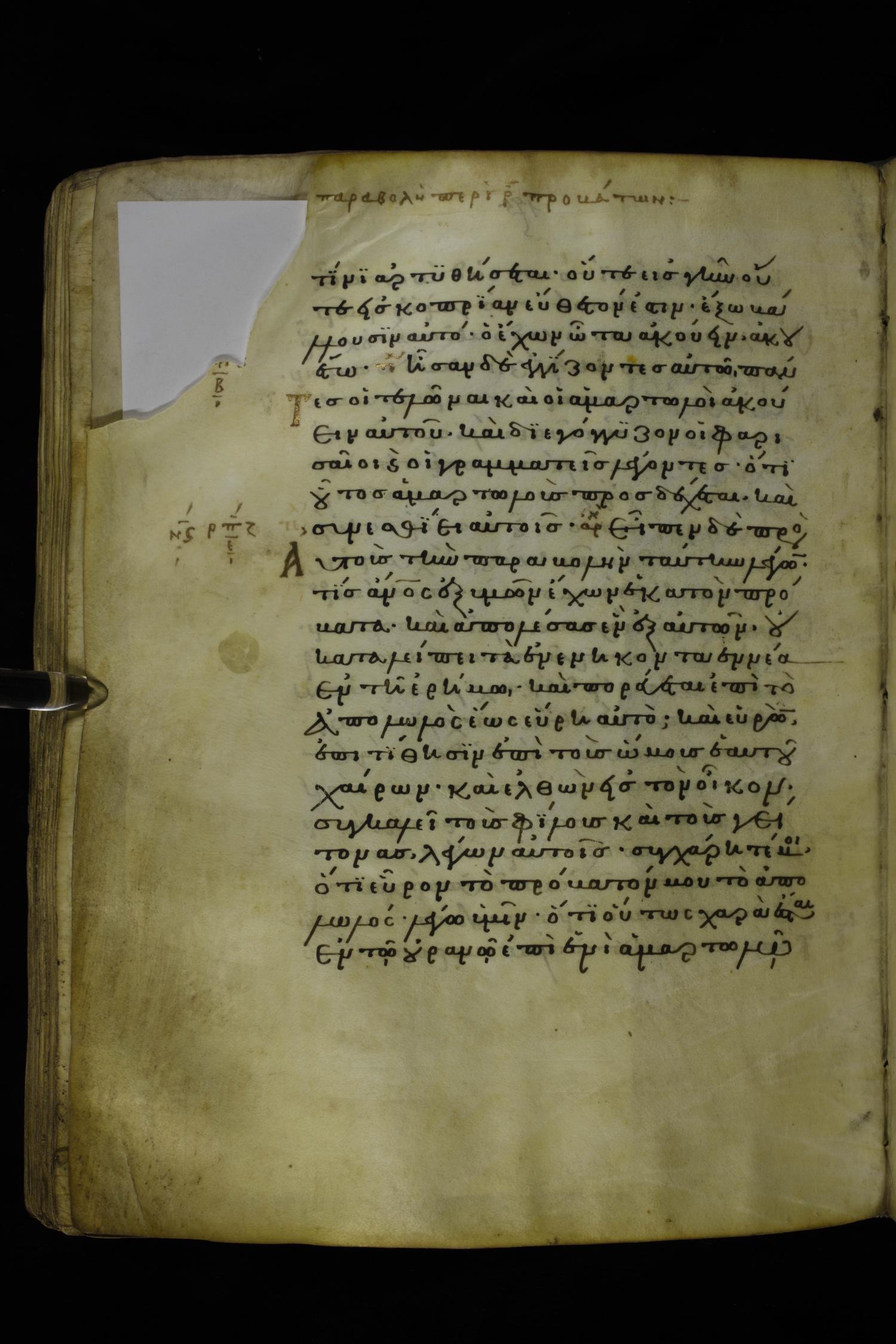 Twelfth century minuscule of the Gospels on parchment; 277 leaves, 1 column, 22 lines per column. Images were taken at the National Library of Greece in Athens.