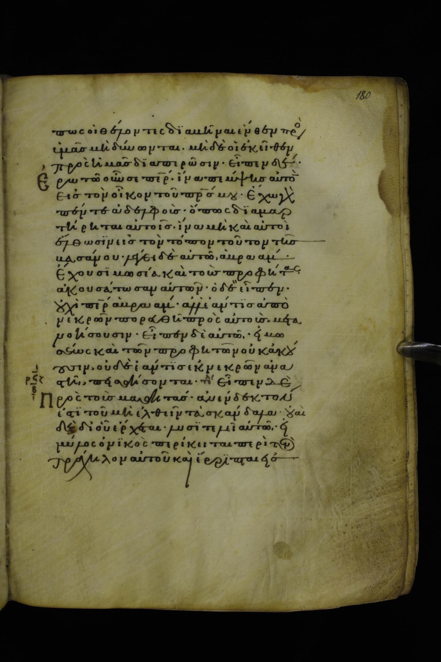 Twelfth century minuscule of the Gospels on parchment; 277 leaves, 1 column, 22 lines per column. Images were taken at the National Library of Greece in Athens.