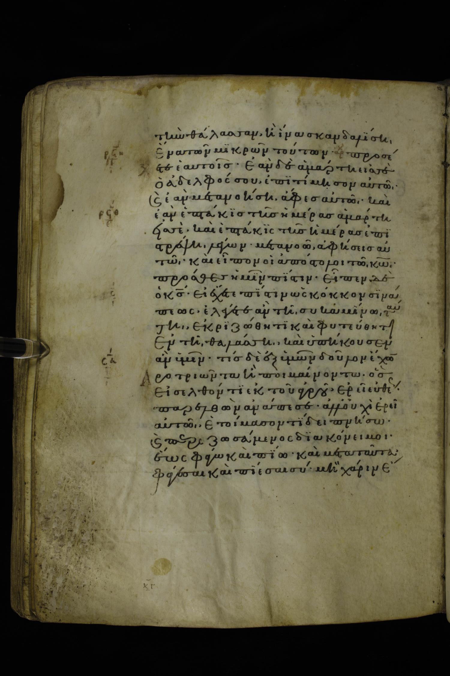 Twelfth century minuscule of the Gospels on parchment; 277 leaves, 1 column, 22 lines per column. Images were taken at the National Library of Greece in Athens.