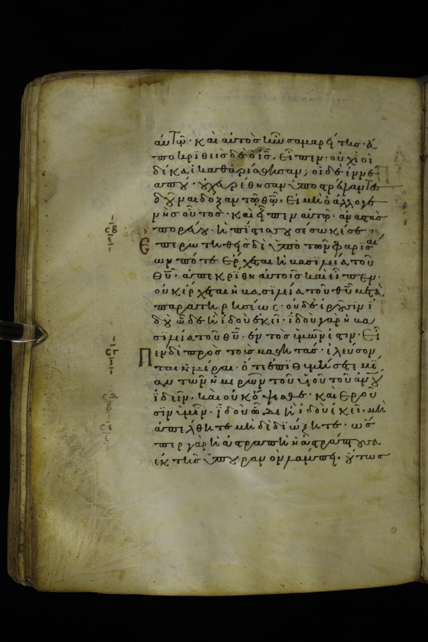 Twelfth century minuscule of the Gospels on parchment; 277 leaves, 1 column, 22 lines per column. Images were taken at the National Library of Greece in Athens.