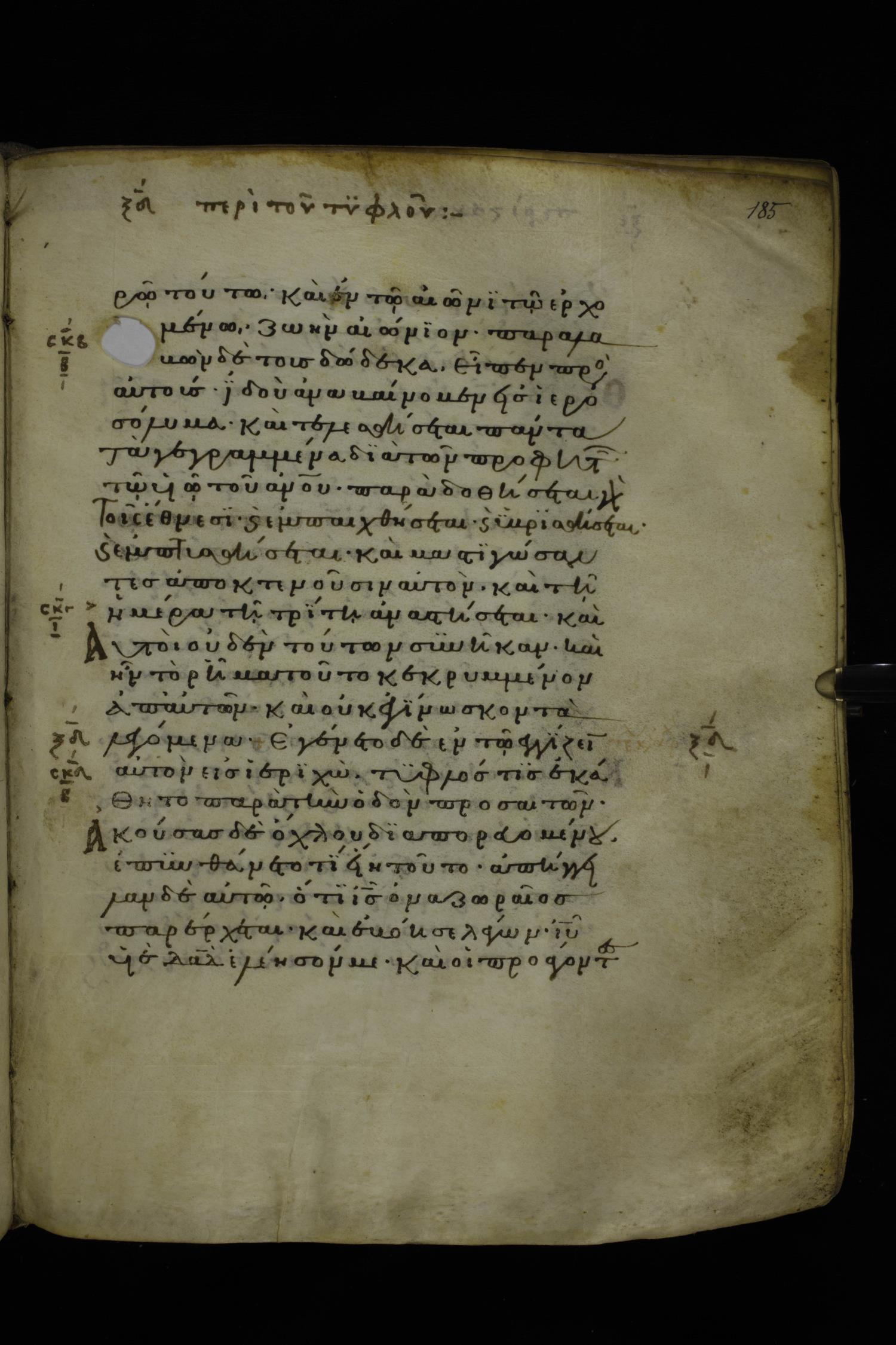 Twelfth century minuscule of the Gospels on parchment; 277 leaves, 1 column, 22 lines per column. Images were taken at the National Library of Greece in Athens.