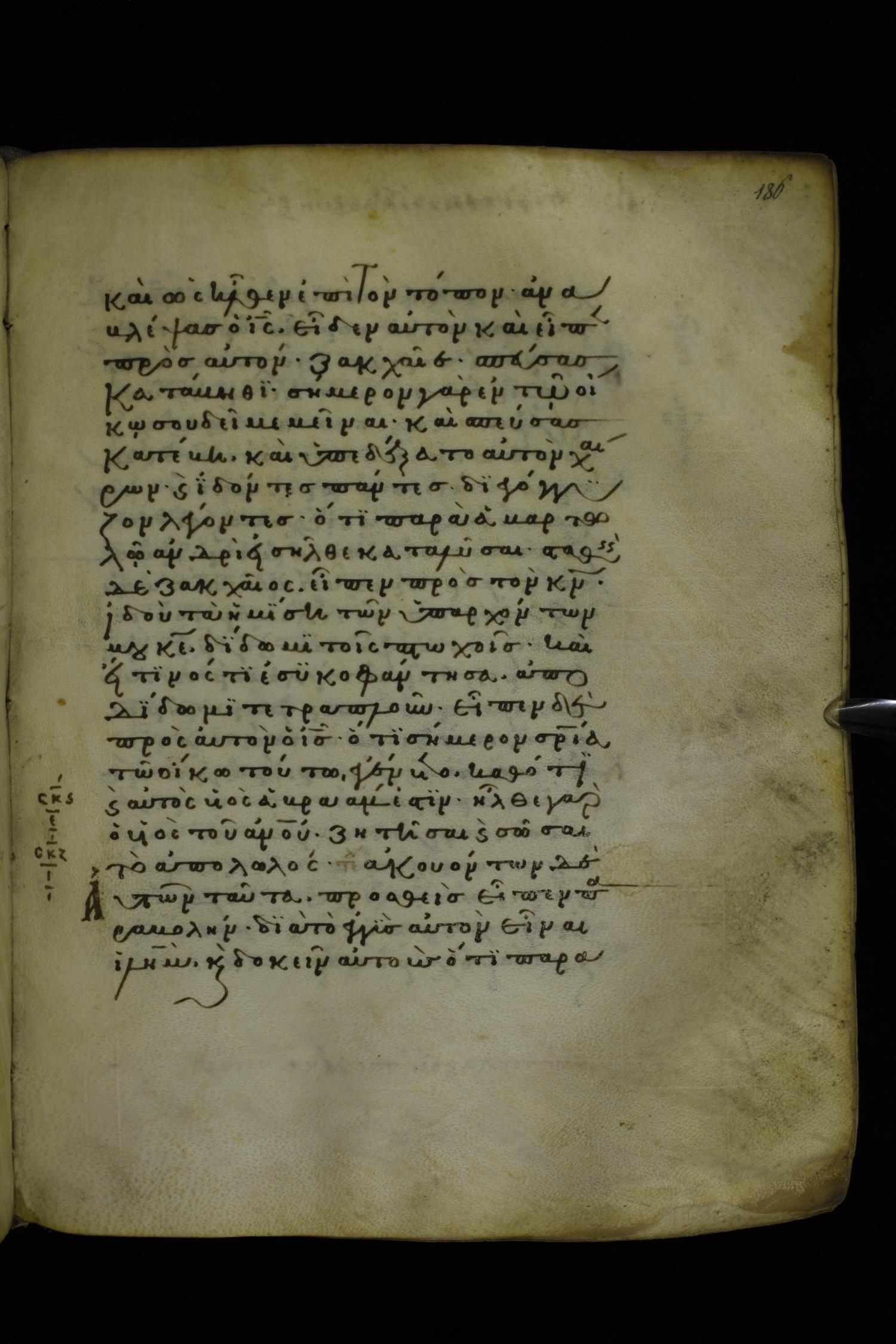 Twelfth century minuscule of the Gospels on parchment; 277 leaves, 1 column, 22 lines per column. Images were taken at the National Library of Greece in Athens.