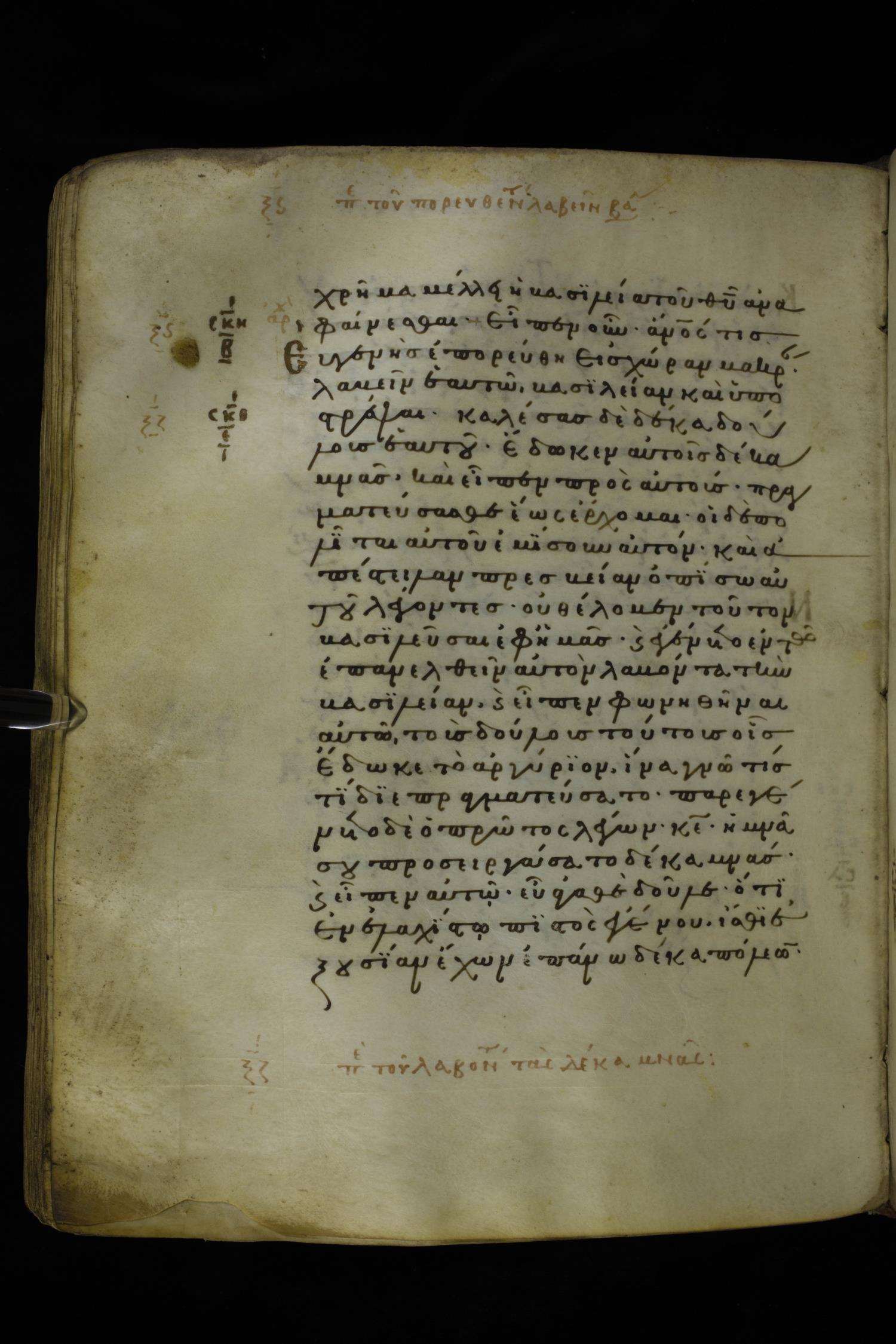 Twelfth century minuscule of the Gospels on parchment; 277 leaves, 1 column, 22 lines per column. Images were taken at the National Library of Greece in Athens.