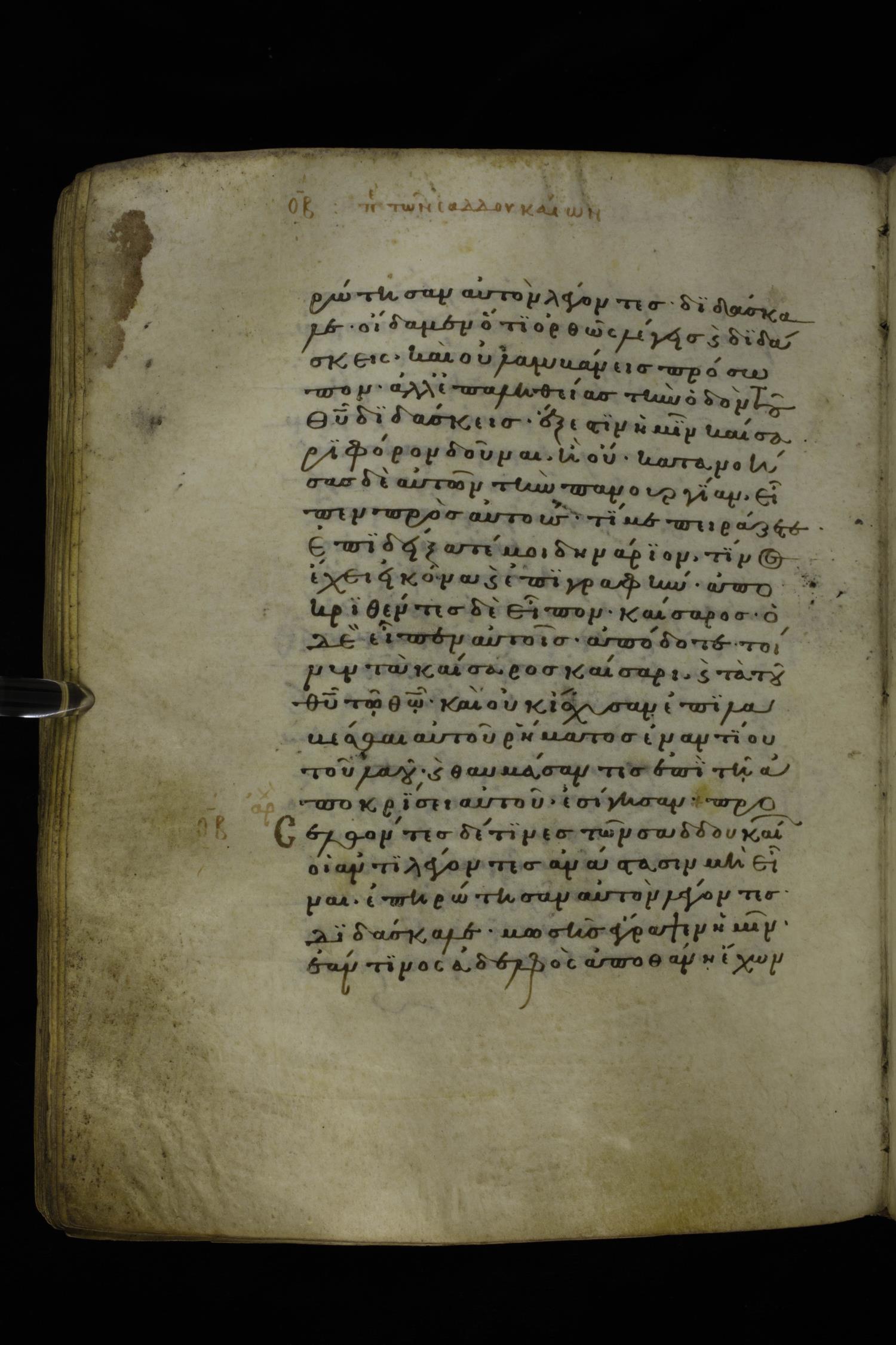 Twelfth century minuscule of the Gospels on parchment; 277 leaves, 1 column, 22 lines per column. Images were taken at the National Library of Greece in Athens.