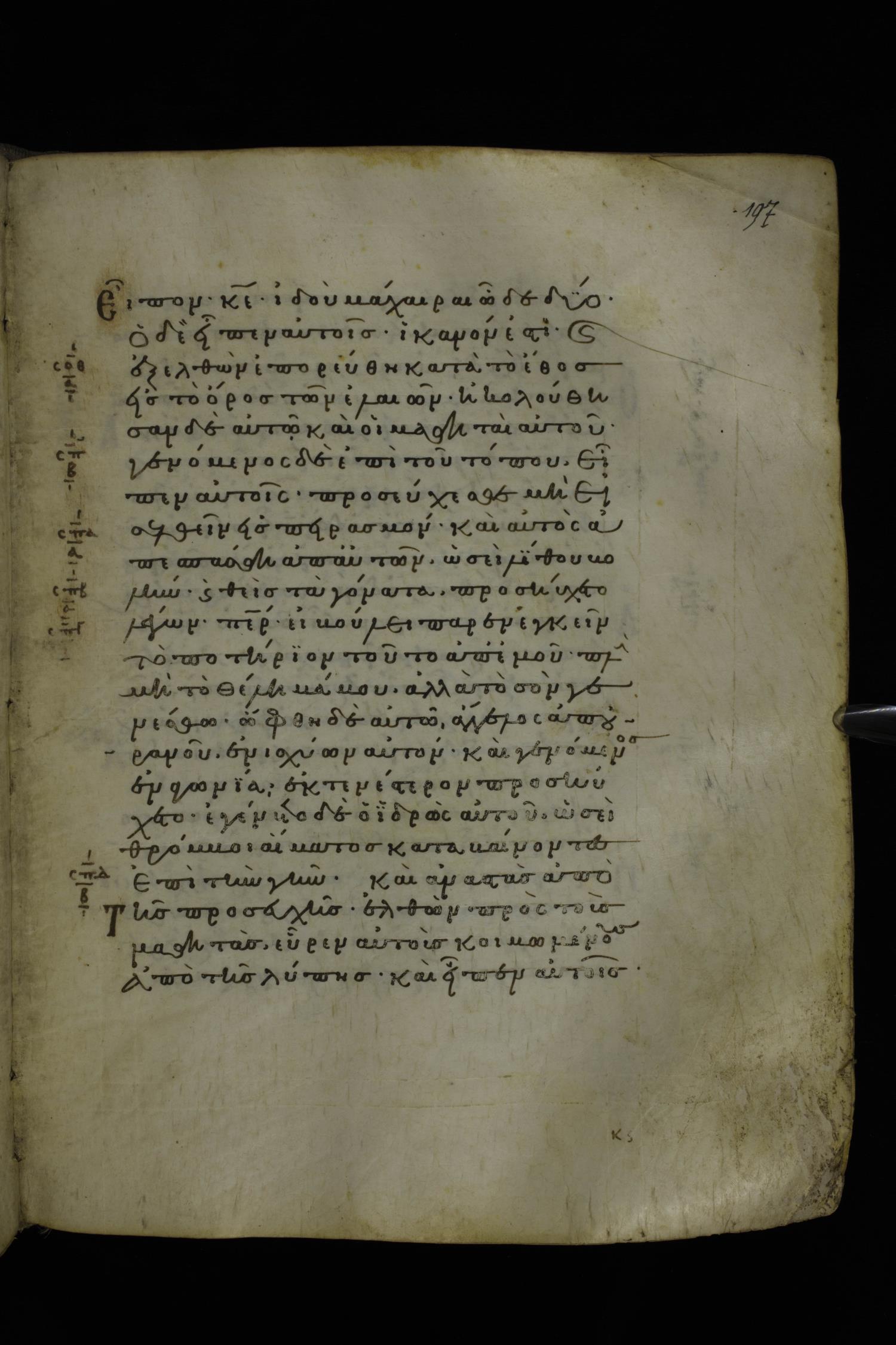 Twelfth century minuscule of the Gospels on parchment; 277 leaves, 1 column, 22 lines per column. Images were taken at the National Library of Greece in Athens.