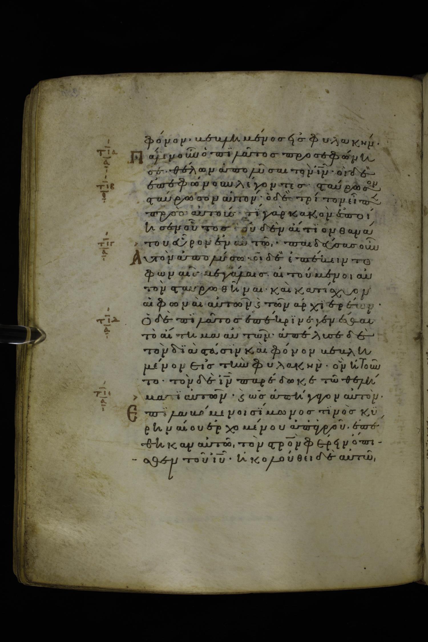 Twelfth century minuscule of the Gospels on parchment; 277 leaves, 1 column, 22 lines per column. Images were taken at the National Library of Greece in Athens.