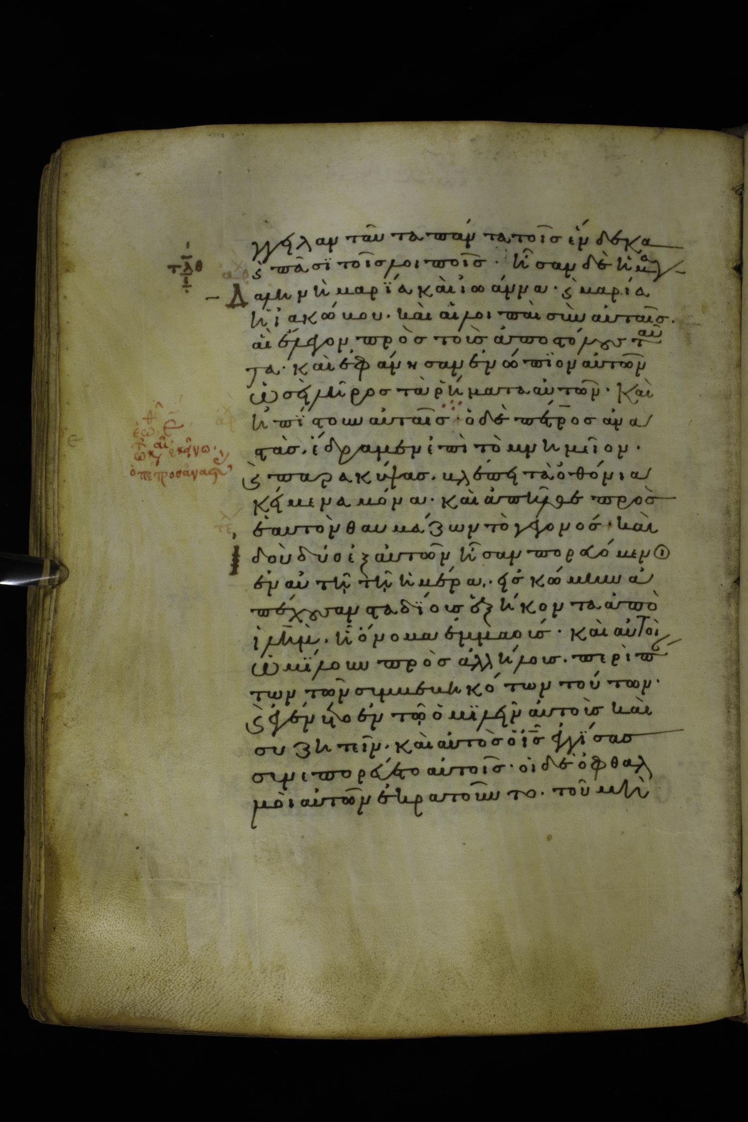 Twelfth century minuscule of the Gospels on parchment; 277 leaves, 1 column, 22 lines per column. Images were taken at the National Library of Greece in Athens.