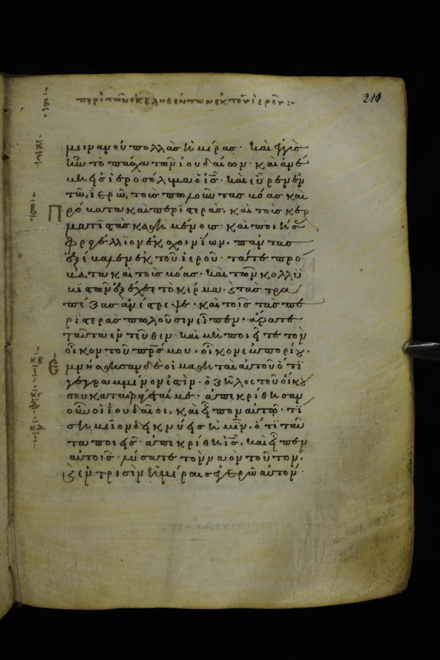 Twelfth century minuscule of the Gospels on parchment; 277 leaves, 1 column, 22 lines per column. Images were taken at the National Library of Greece in Athens.