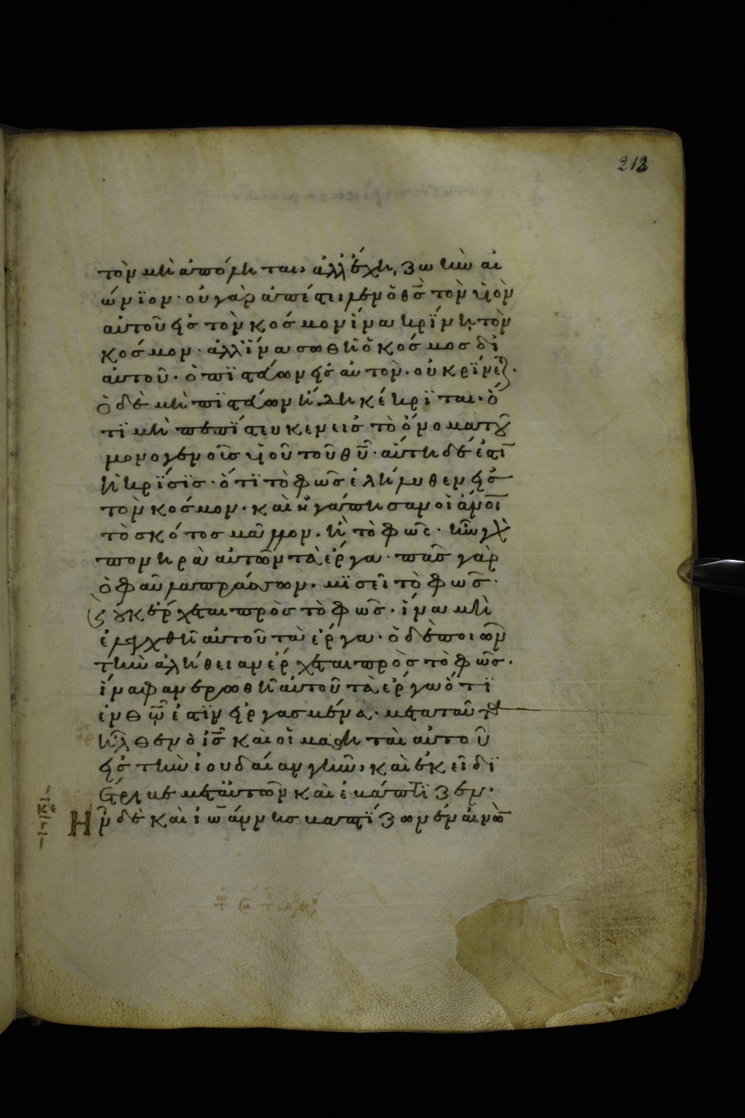 Twelfth century minuscule of the Gospels on parchment; 277 leaves, 1 column, 22 lines per column. Images were taken at the National Library of Greece in Athens.