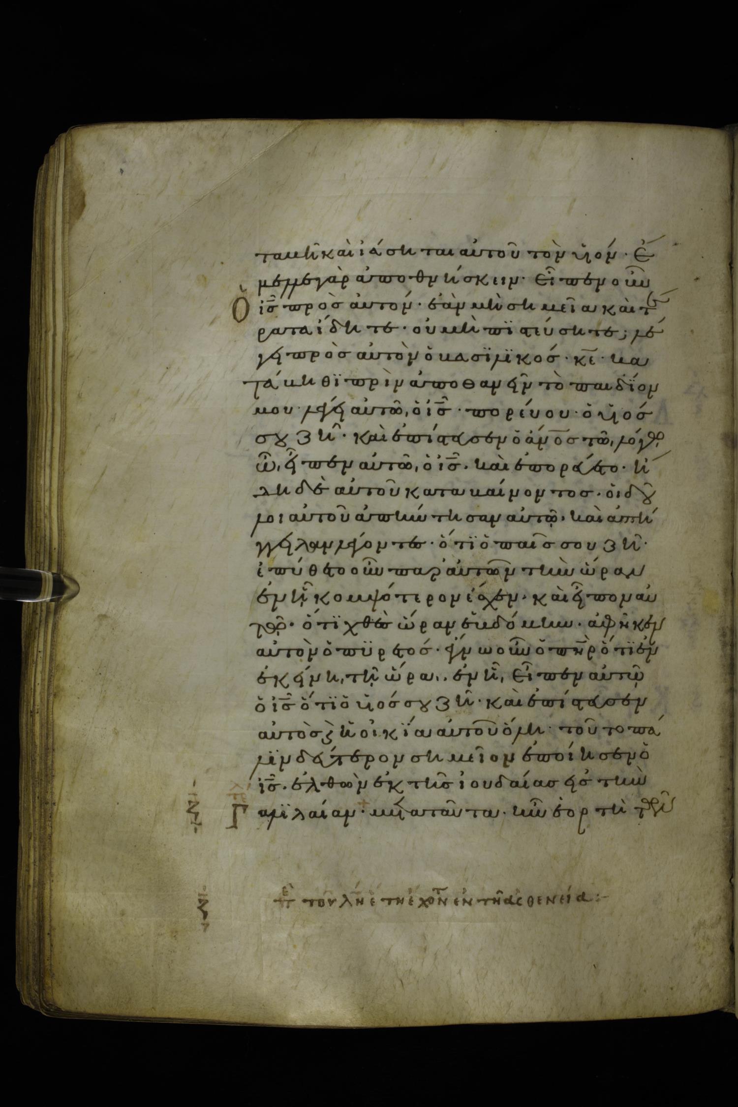 Twelfth century minuscule of the Gospels on parchment; 277 leaves, 1 column, 22 lines per column. Images were taken at the National Library of Greece in Athens.