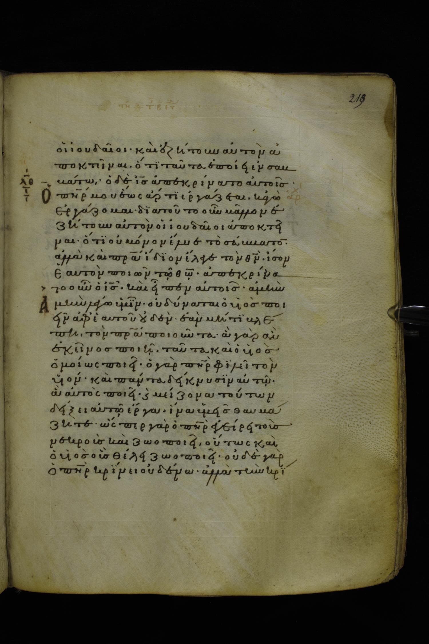 Twelfth century minuscule of the Gospels on parchment; 277 leaves, 1 column, 22 lines per column. Images were taken at the National Library of Greece in Athens.