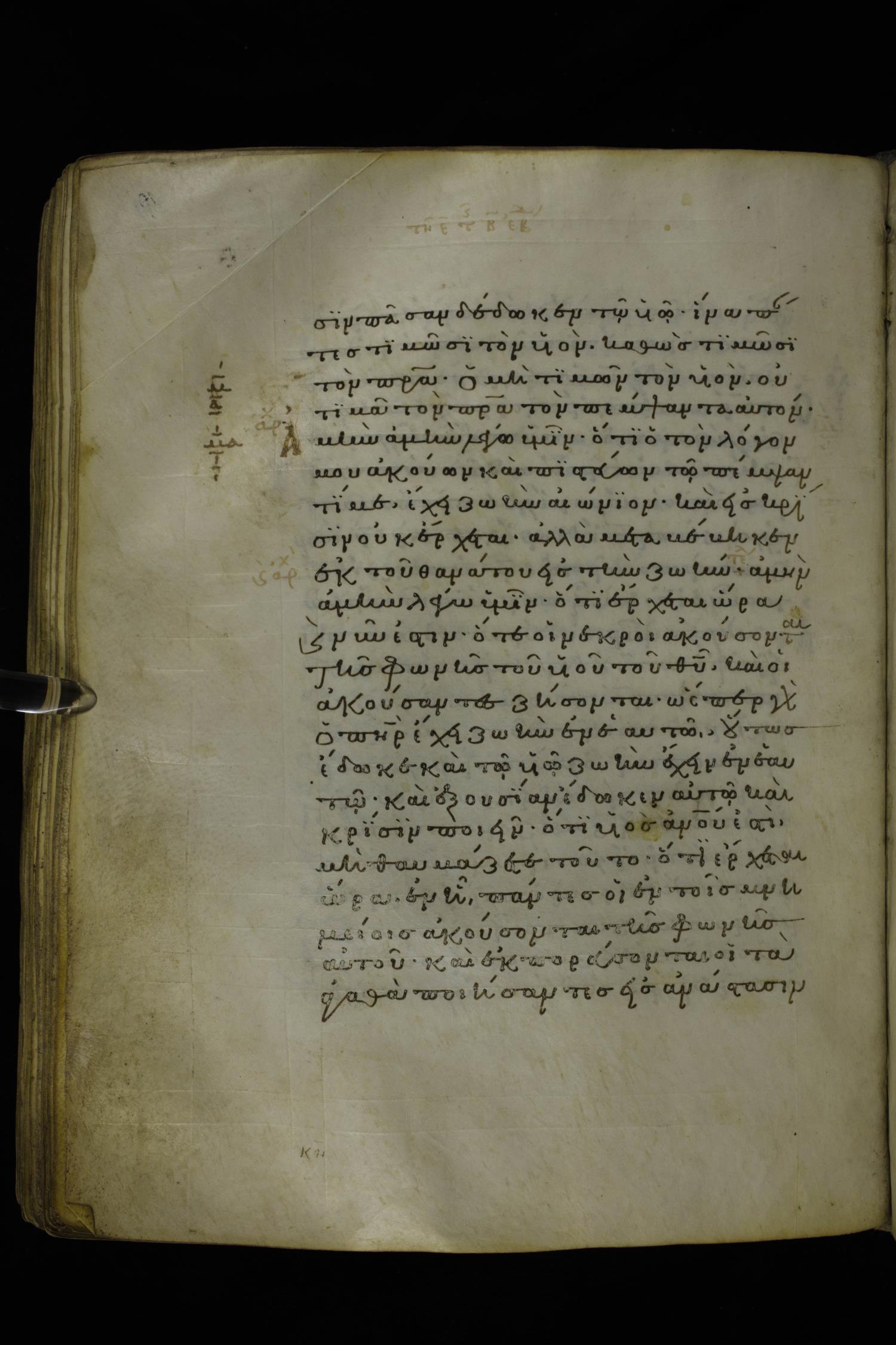 Twelfth century minuscule of the Gospels on parchment; 277 leaves, 1 column, 22 lines per column. Images were taken at the National Library of Greece in Athens.