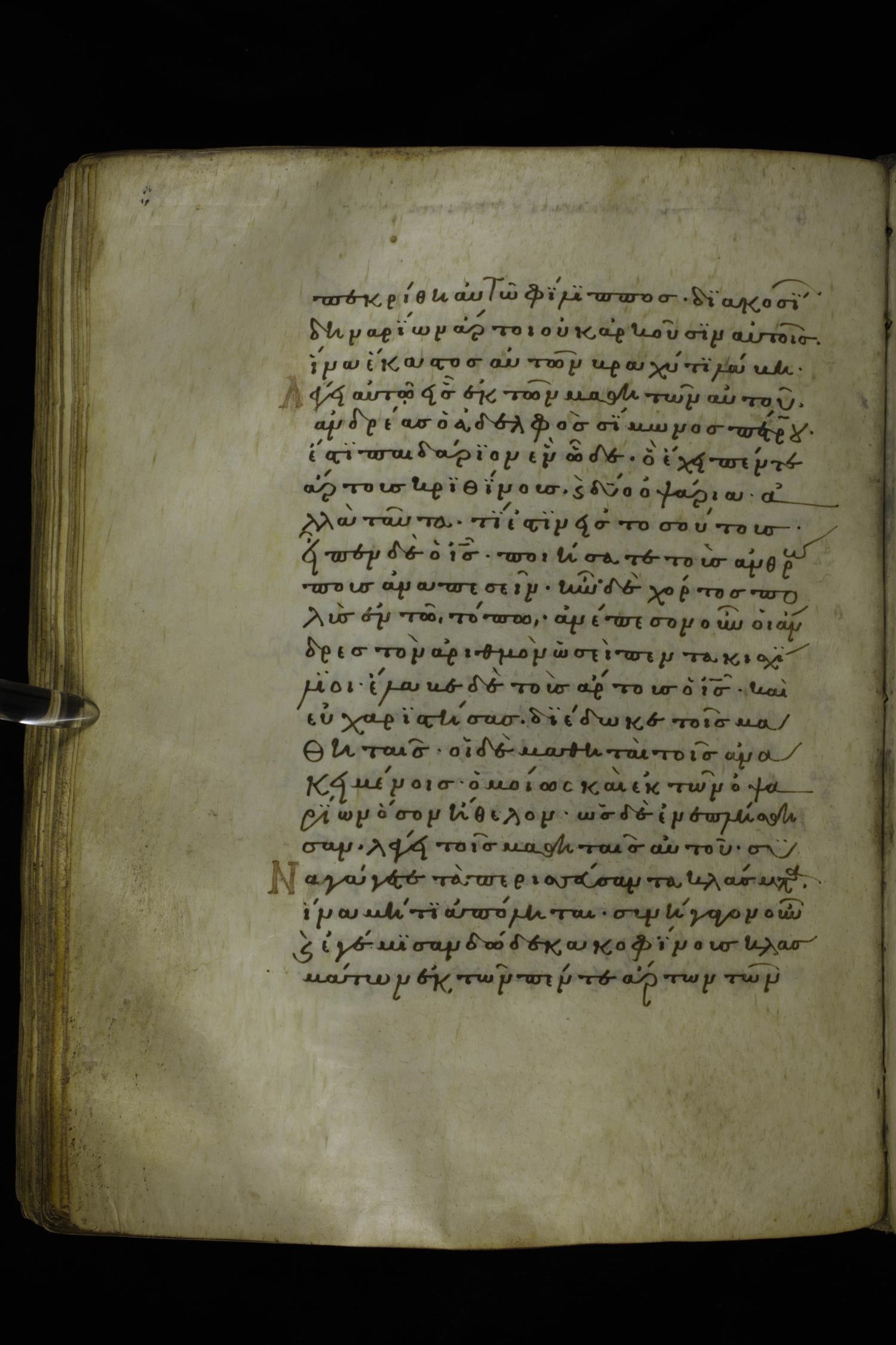 Twelfth century minuscule of the Gospels on parchment; 277 leaves, 1 column, 22 lines per column. Images were taken at the National Library of Greece in Athens.