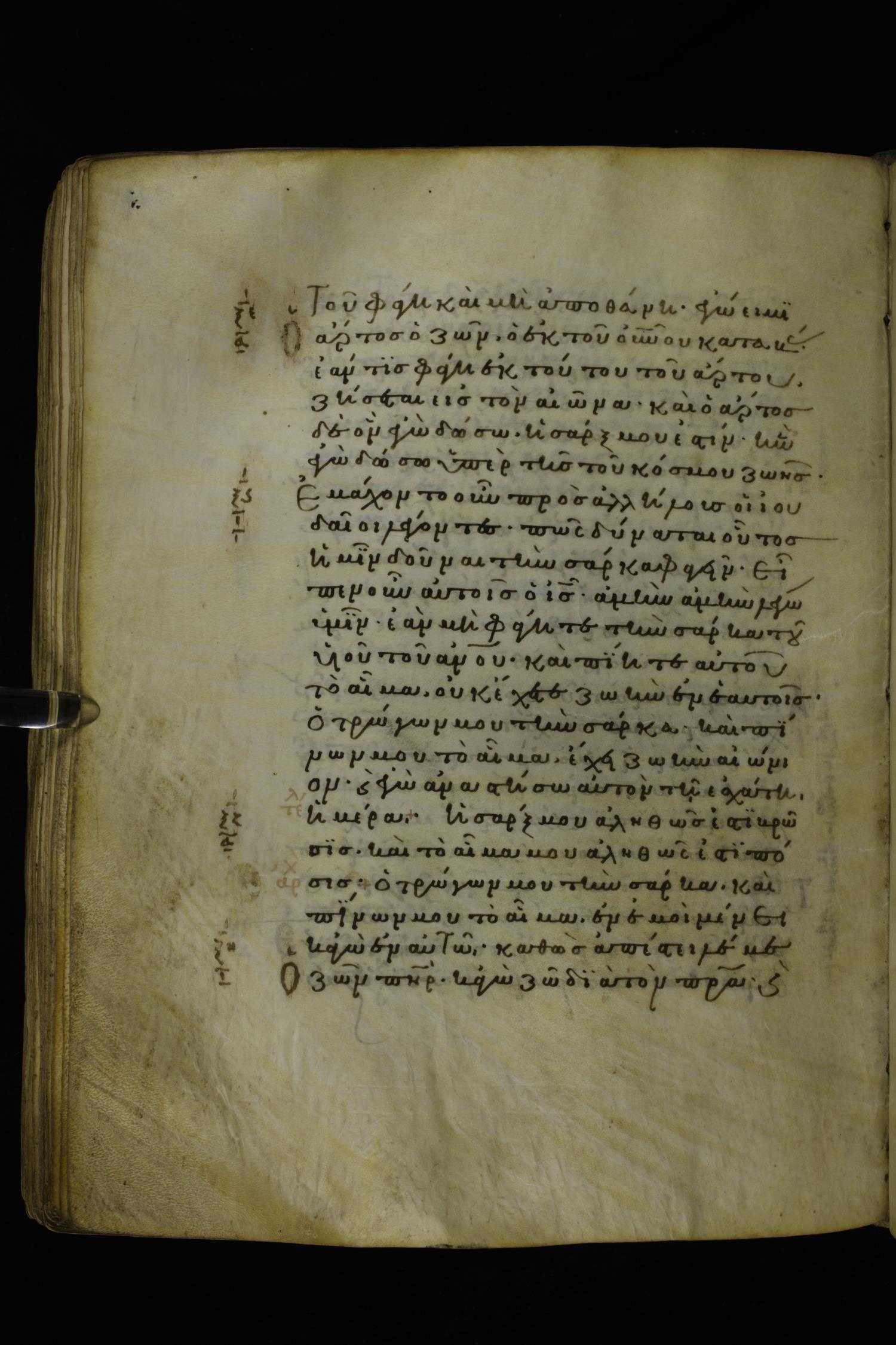 Twelfth century minuscule of the Gospels on parchment; 277 leaves, 1 column, 22 lines per column. Images were taken at the National Library of Greece in Athens.