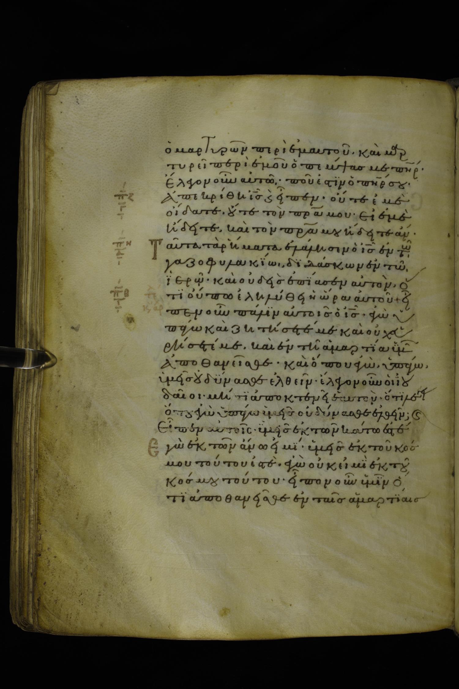 Twelfth century minuscule of the Gospels on parchment; 277 leaves, 1 column, 22 lines per column. Images were taken at the National Library of Greece in Athens.