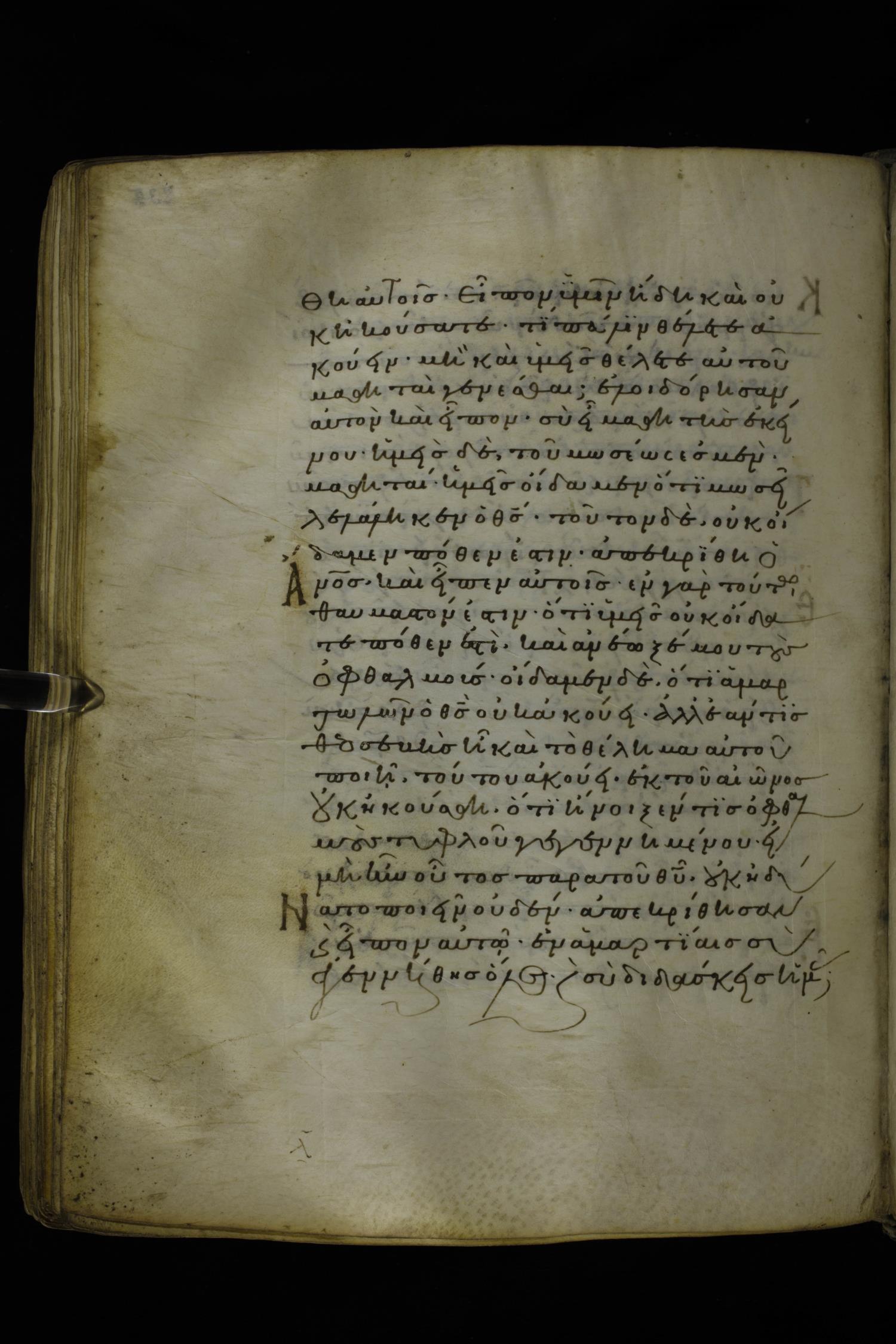 Twelfth century minuscule of the Gospels on parchment; 277 leaves, 1 column, 22 lines per column. Images were taken at the National Library of Greece in Athens.