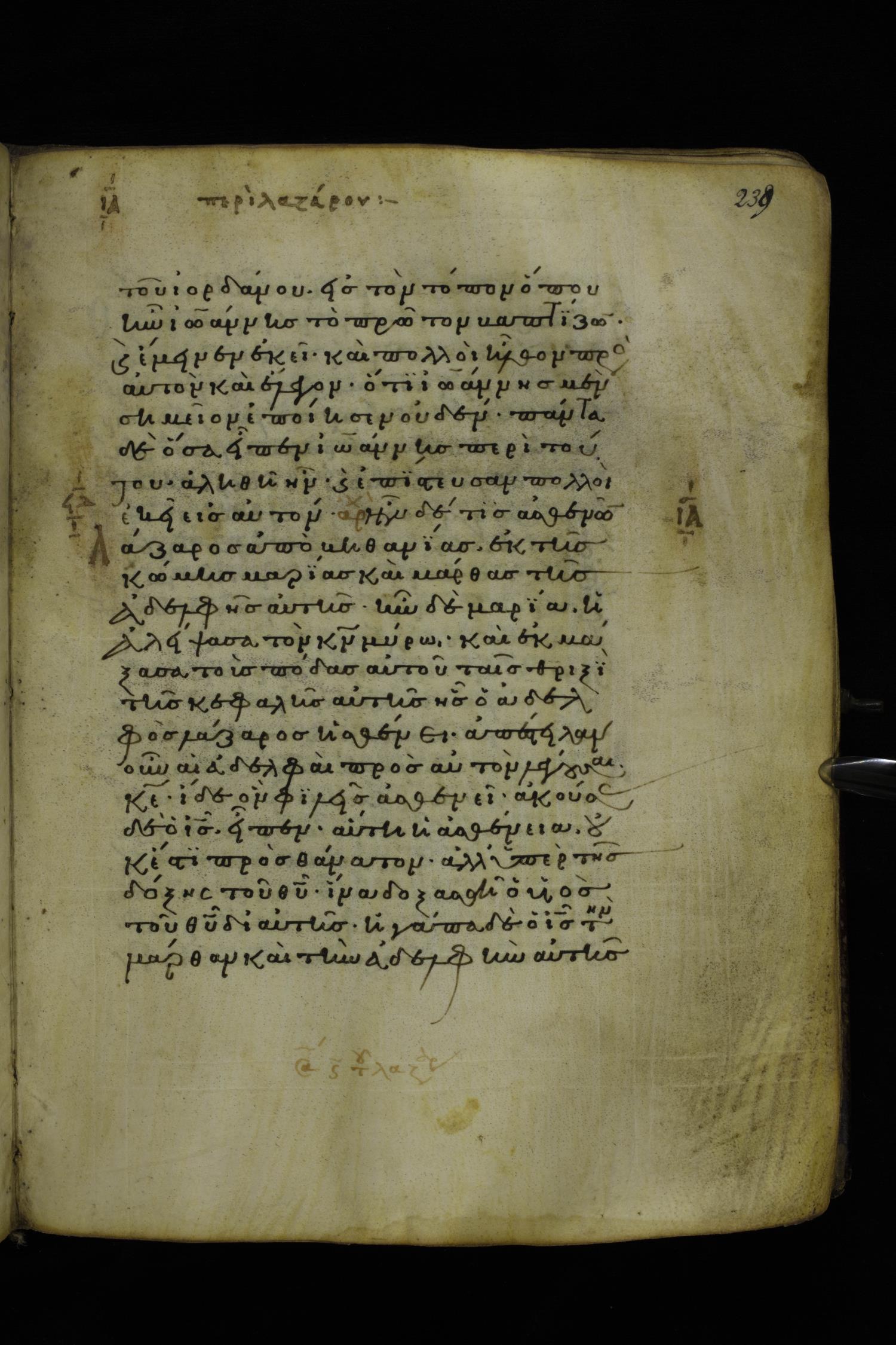 Twelfth century minuscule of the Gospels on parchment; 277 leaves, 1 column, 22 lines per column. Images were taken at the National Library of Greece in Athens.