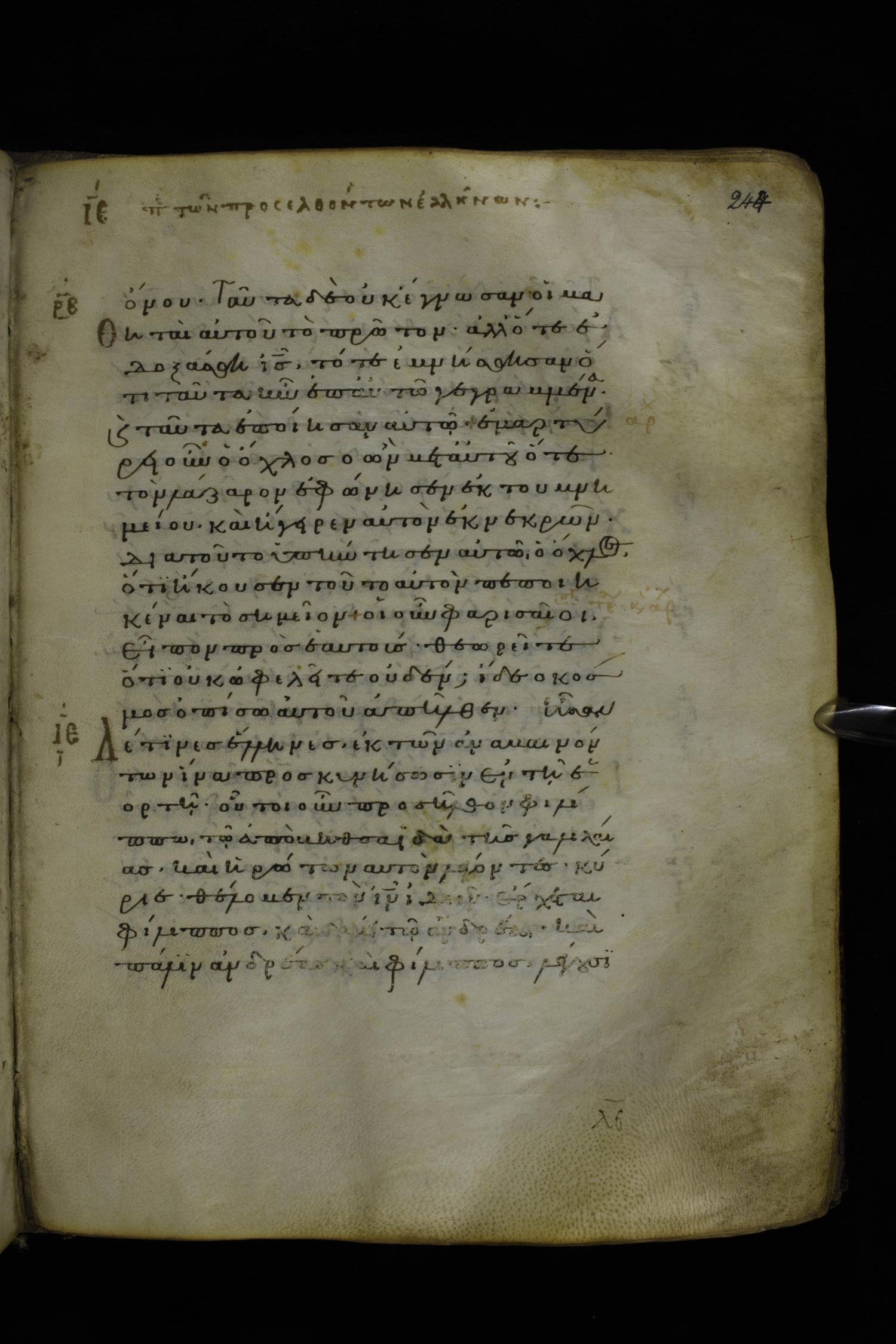 Twelfth century minuscule of the Gospels on parchment; 277 leaves, 1 column, 22 lines per column. Images were taken at the National Library of Greece in Athens.