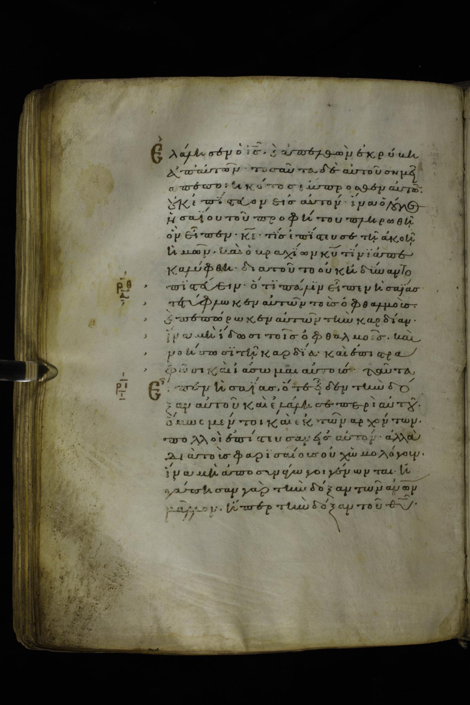 Twelfth century minuscule of the Gospels on parchment; 277 leaves, 1 column, 22 lines per column. Images were taken at the National Library of Greece in Athens.