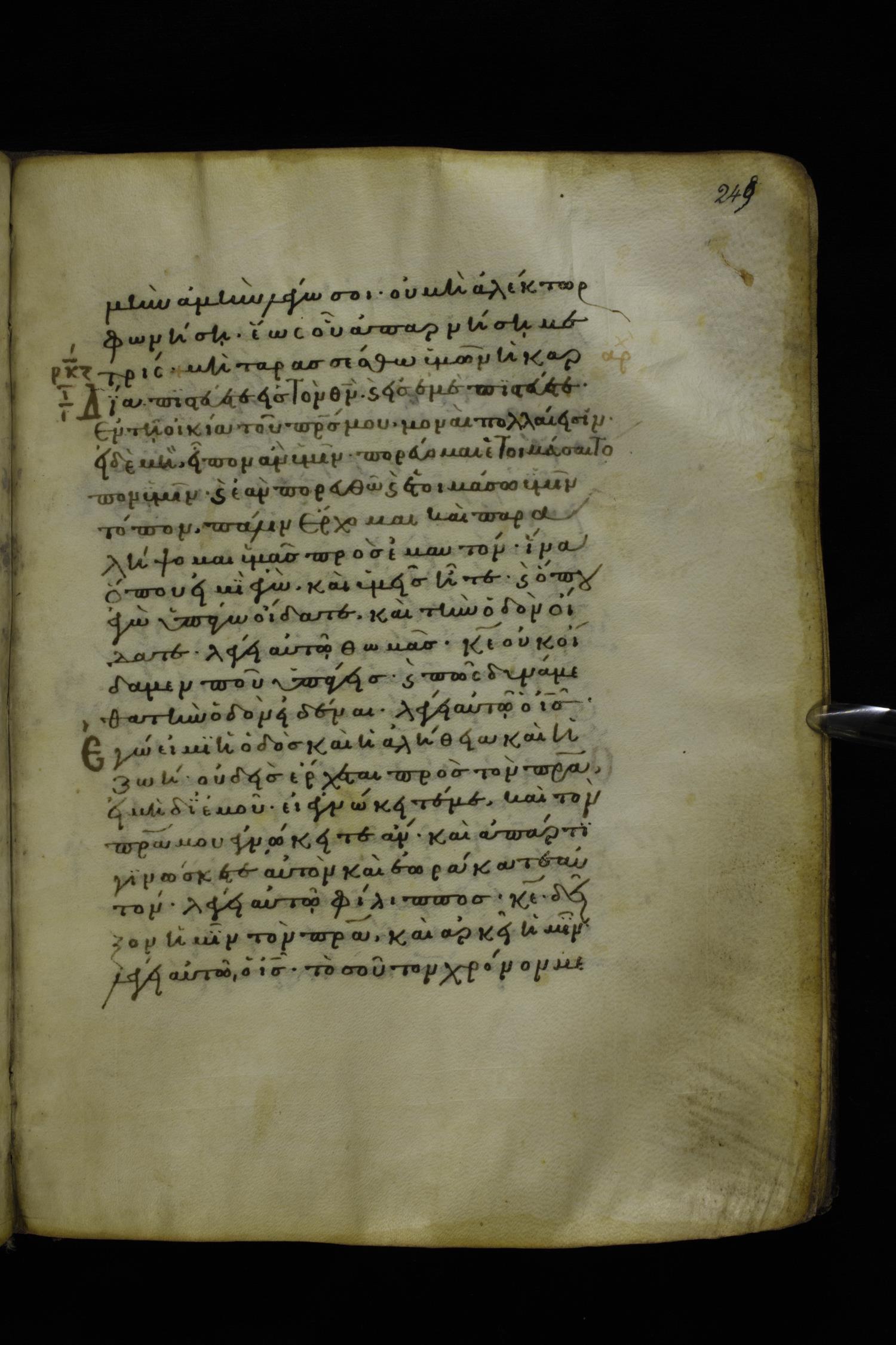 Twelfth century minuscule of the Gospels on parchment; 277 leaves, 1 column, 22 lines per column. Images were taken at the National Library of Greece in Athens.