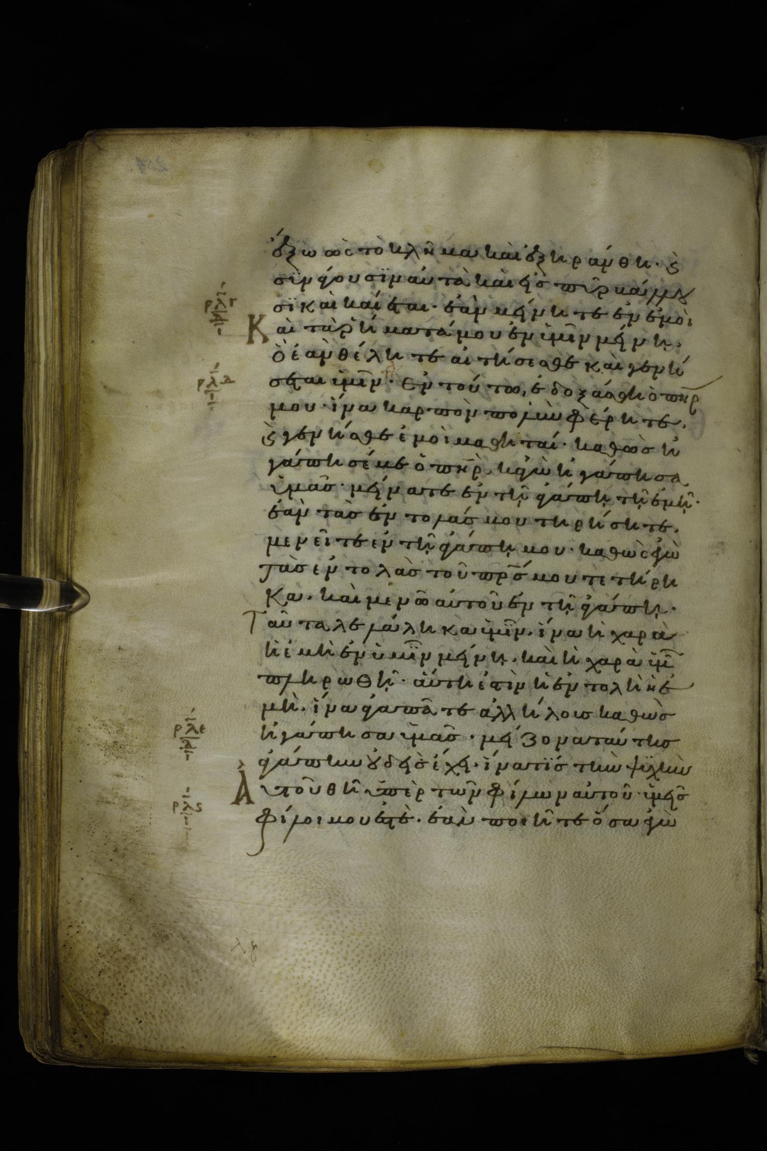 Twelfth century minuscule of the Gospels on parchment; 277 leaves, 1 column, 22 lines per column. Images were taken at the National Library of Greece in Athens.