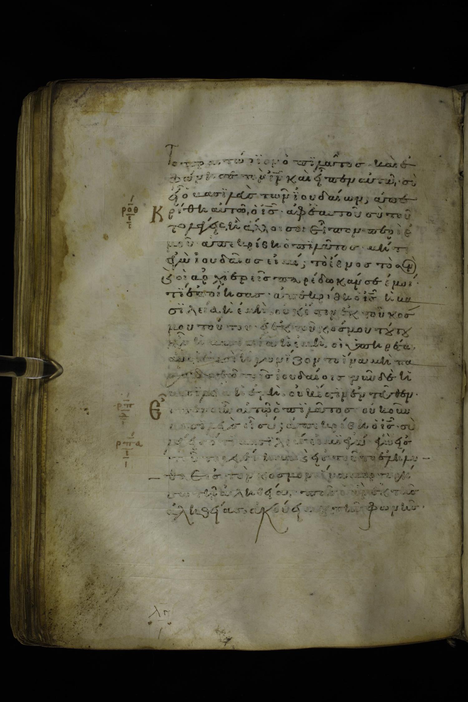 Twelfth century minuscule of the Gospels on parchment; 277 leaves, 1 column, 22 lines per column. Images were taken at the National Library of Greece in Athens.