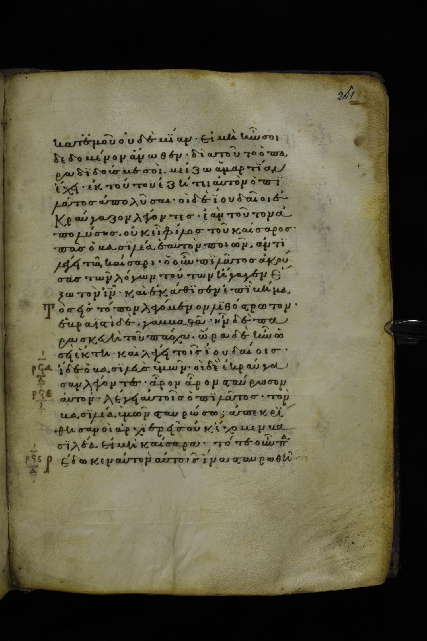 Twelfth century minuscule of the Gospels on parchment; 277 leaves, 1 column, 22 lines per column. Images were taken at the National Library of Greece in Athens.