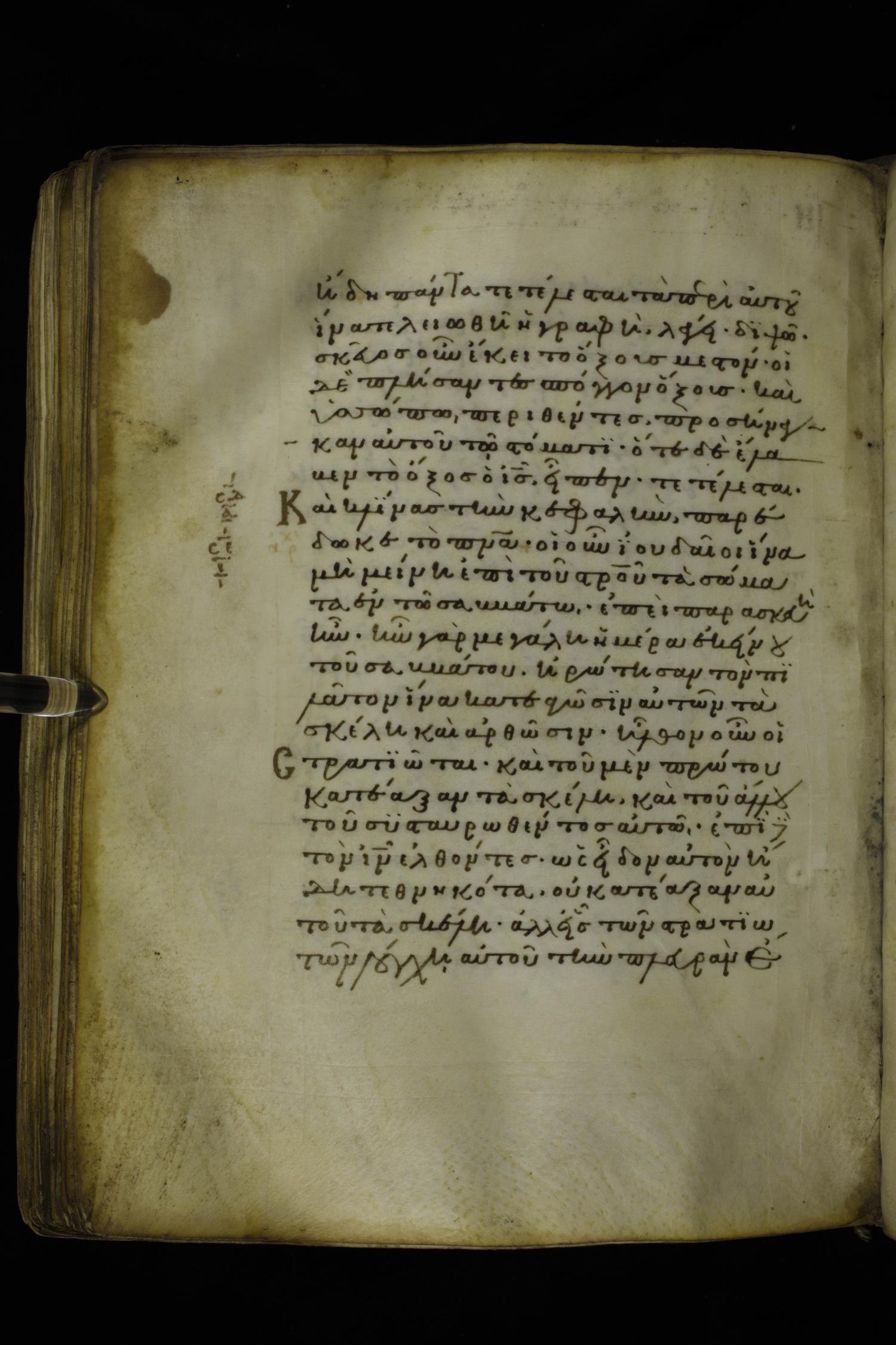 Twelfth century minuscule of the Gospels on parchment; 277 leaves, 1 column, 22 lines per column. Images were taken at the National Library of Greece in Athens.