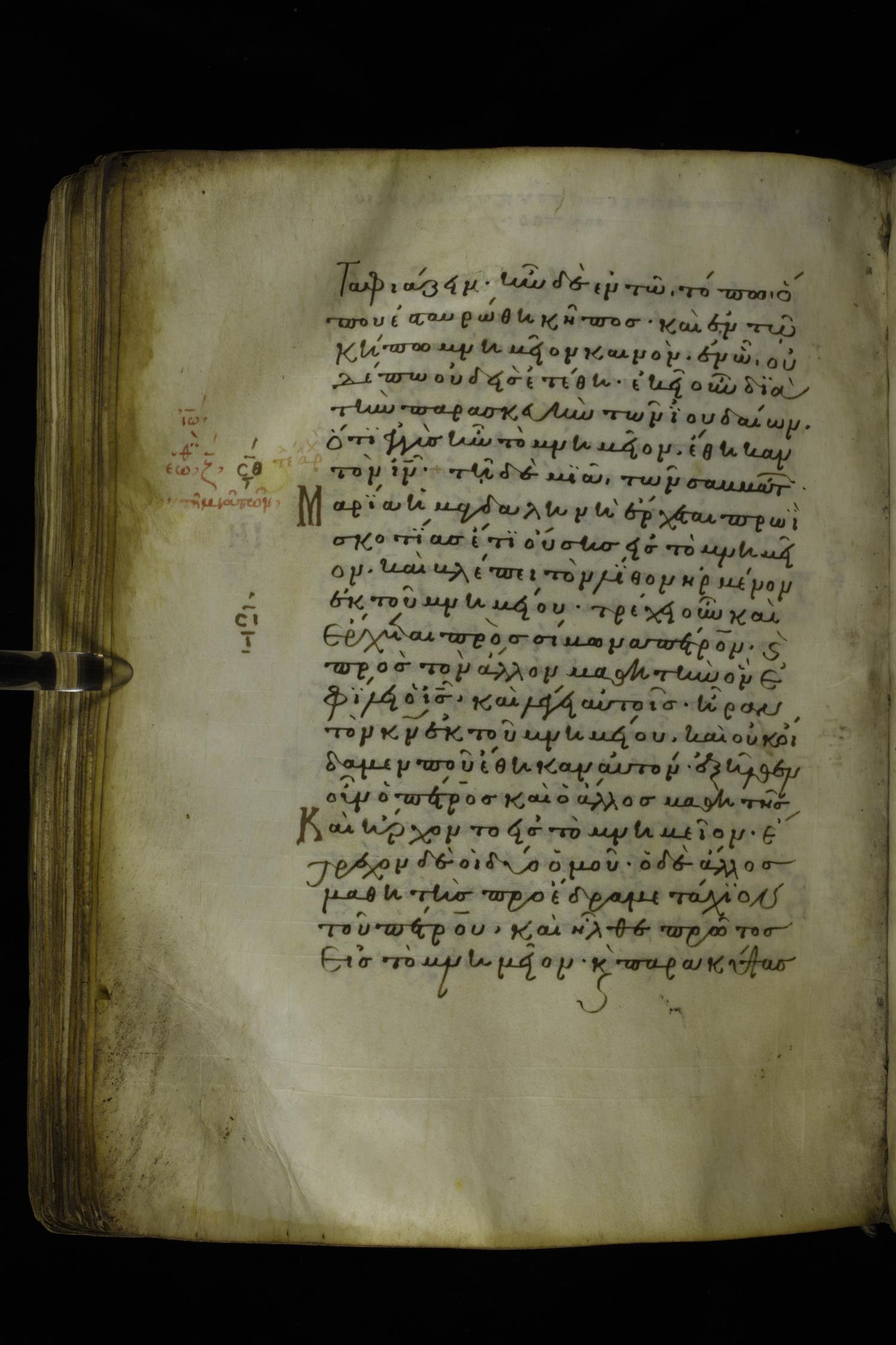 Twelfth century minuscule of the Gospels on parchment; 277 leaves, 1 column, 22 lines per column. Images were taken at the National Library of Greece in Athens.