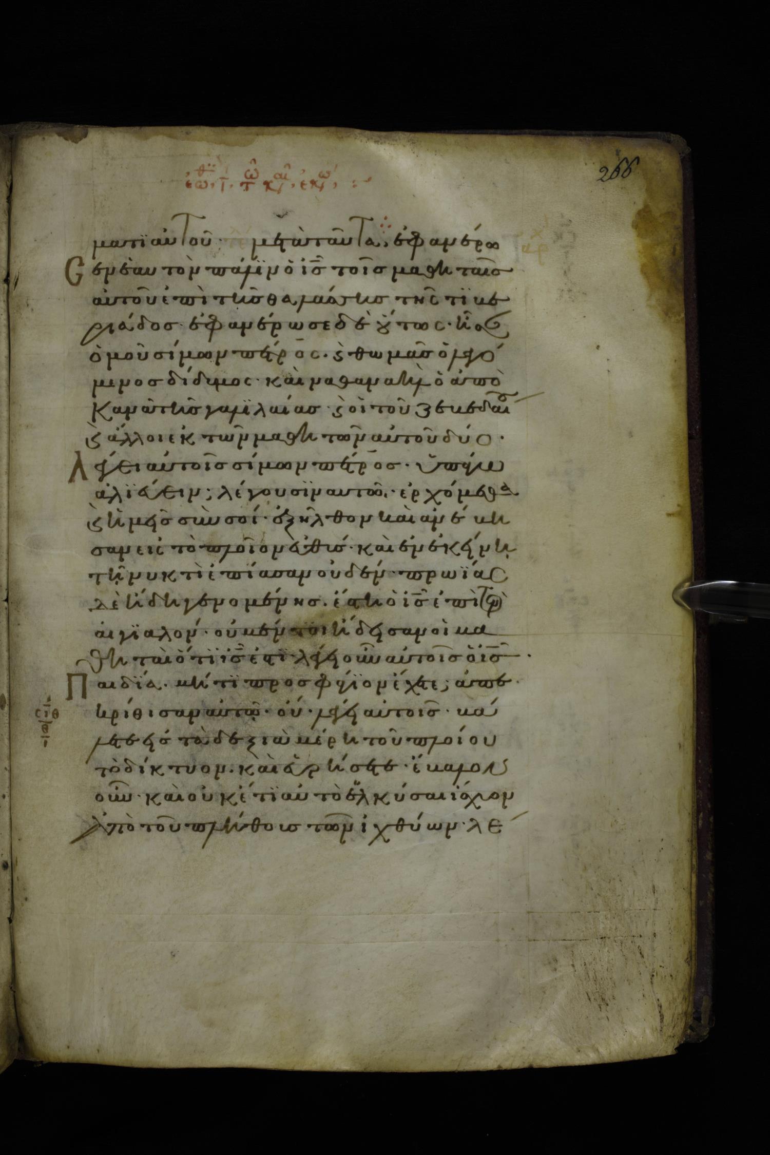 Twelfth century minuscule of the Gospels on parchment; 277 leaves, 1 column, 22 lines per column. Images were taken at the National Library of Greece in Athens.