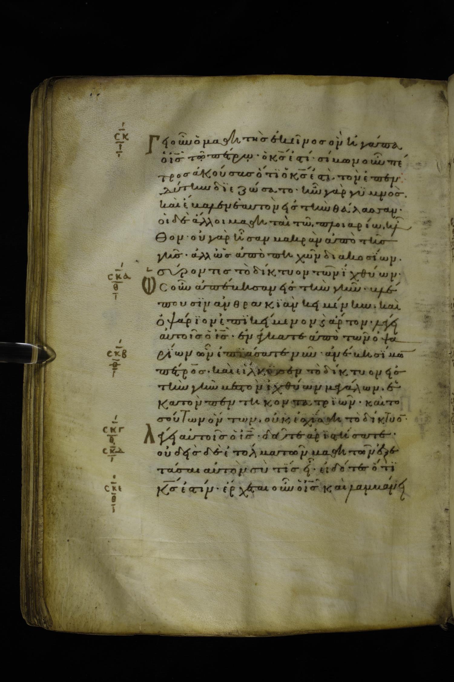 Twelfth century minuscule of the Gospels on parchment; 277 leaves, 1 column, 22 lines per column. Images were taken at the National Library of Greece in Athens.