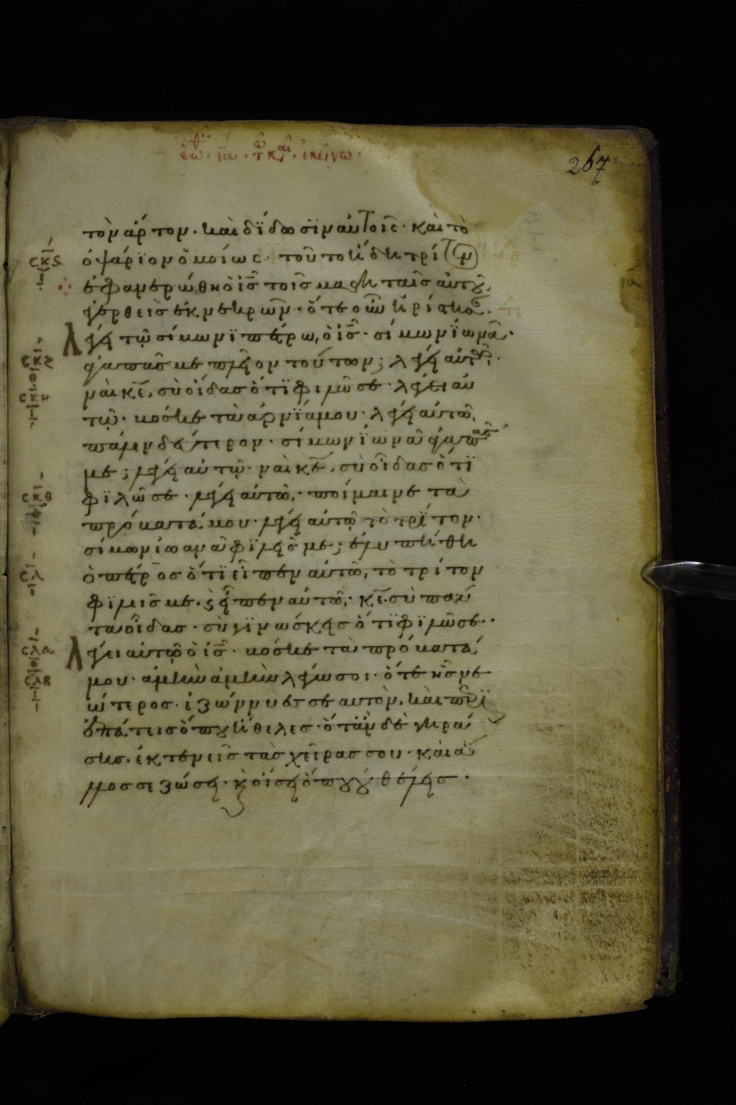 Twelfth century minuscule of the Gospels on parchment; 277 leaves, 1 column, 22 lines per column. Images were taken at the National Library of Greece in Athens.